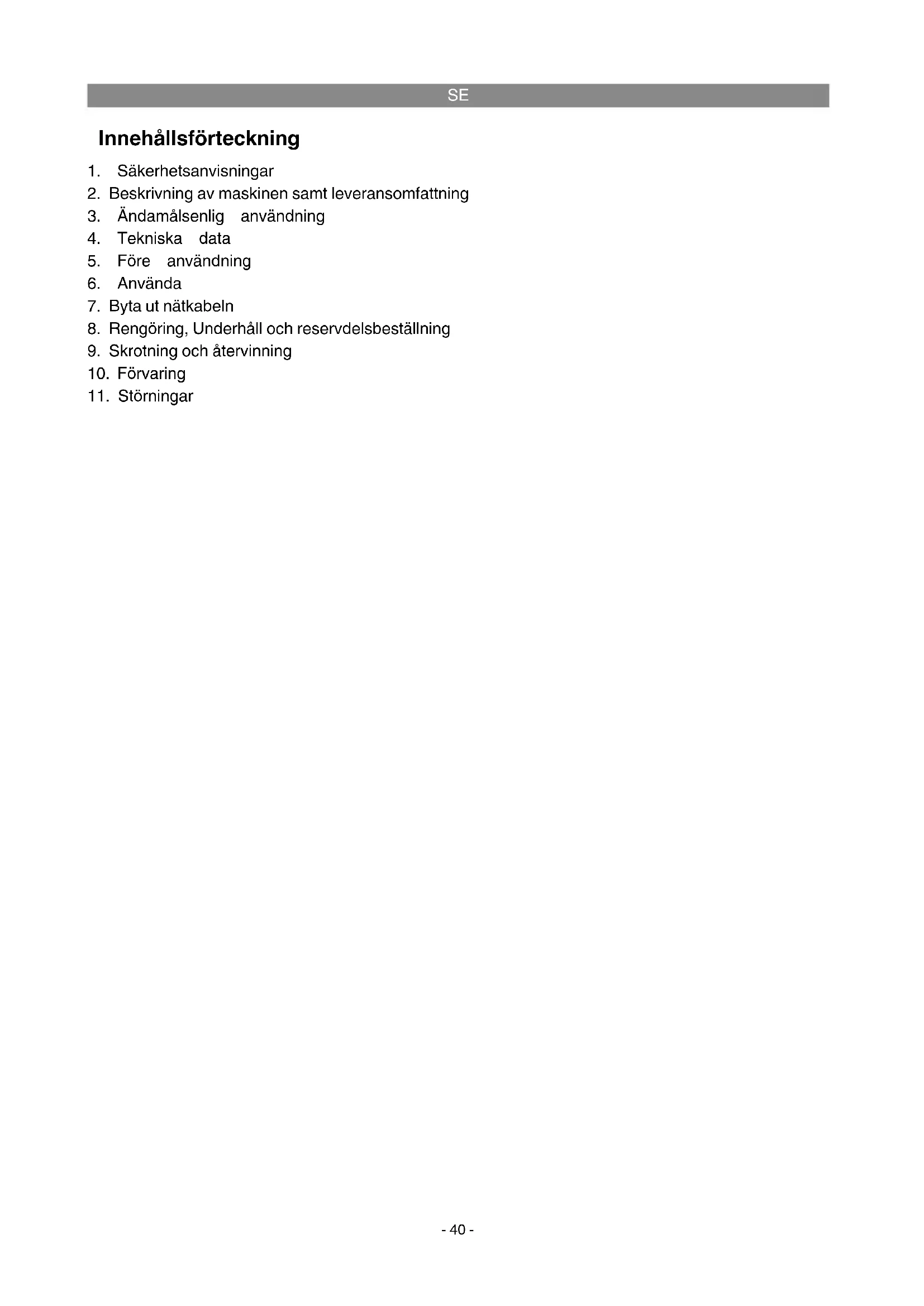 Maskinen får endast användas till sitt avsedda ändamål. Användningar som sträcker sig utöver detta användningsområde är ej ändamålsenliga. För materialskador eller personskador som resul- terar av sådan användning ansvarar användaren/ operatören själv. Tillverkaren påtar sig inget ansvar. Tänk på att våra produkter endast får användas till ändamålsenligt syfte och inte har konstruerats för yrkesmässig, hantverksmässig eller industriell användning. Vi ger därför ingen garanti om pro- dukten ska användas inom yrkesmässiga, hant- verksmässiga eller industriella verksamheter eller vid liknande aktiviteter.