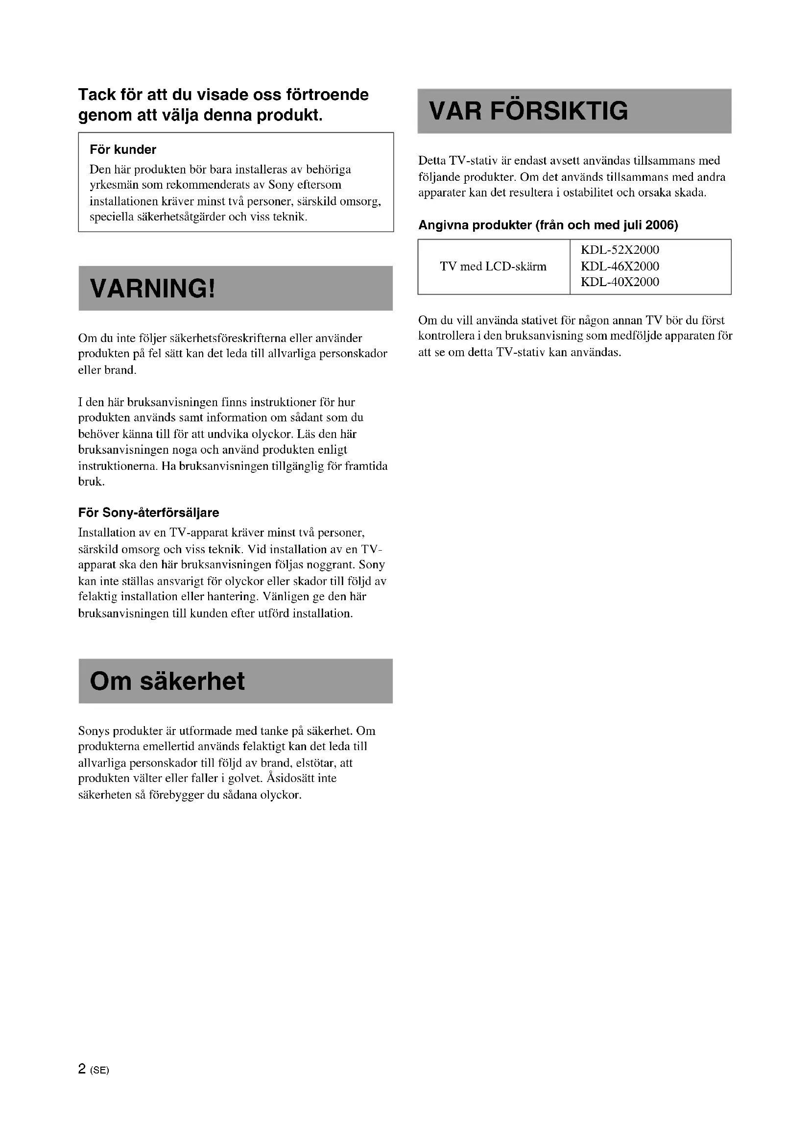 Merknad til bærekapasitet2 (SE) Tack för att du visade oss förtroende genom att välja denna produkt. Om du inte följer säkerhetsföreskrifterna eller använder produkten på fel sätt kan det leda till allvarliga personskador eller brand. I den här bruksanvisningen finns instruktioner för hur produkten används samt information om sådant som du behöver känna till för att undvika olyckor. Läs den här bruksanvisningen noga och använd produkten enligt instruktionerna. Ha bruksanvisningen tillgänglig för framtida bruk. För Sony-återförsäljare Installation av en TV-apparat kräver minst två personer, särskild omsorg och viss teknik. Vid installation av en TV- apparat ska den här bruksanvisningen följas noggrant. Sony kan inte ställas ansvarigt för olyckor eller skador till följd av felaktig installation eller hantering. Vänligen ge den här bruksanvisningen till kunden efter utförd installation. Sonys produkter är utformade med tanke på säkerhet. Om produkterna emellertid används felaktigt kan det leda till allvarliga personskador till följd av brand, elstötar, att produkten välter eller faller i golvet. Åsidosätt inte säkerheten så förebygger du sådana olyckor. Detta TV-stativ är endast avsett användas tillsammans med följande produkter. Om det används tillsammans med andra apparater kan det resultera i ostabilitet och orsaka skada. Angivna produkter (från och med juli 2006) Om du vill använda stativet för någon annan TV bör du först kontrollera i den bruksanvisning som medföljde apparaten för att se om detta TV-stativ kan användas. För kunder Den här produkten bör bara installeras av behöriga yrkesmän som rekommenderats av Sony eftersom installationen kräver minst två personer, särskild omsorg, speciella säkerhetsåtgärder och viss teknik. VARNING! Om säkerhet