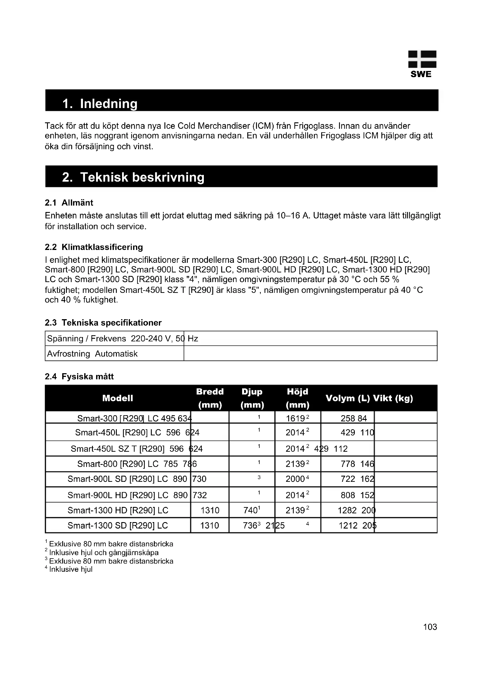 Modellerna Smart-300 [R290] LC, Smart-450L [R290] LC, Smart- 450L SZ T [R290], Smart-800 [R290] LC, Smart-900L SD [R290] LC, Smart-900L HD [R290] LC, Smart-1300 HD [R290] LC och Smart-1300 SD [R290] LC är utrustade med HC-kylmedel. All service på kylmekanism och gasladdning ska utföras i väl ventilerad miljö eller utomhus. Rök inte under underhåll.SWE