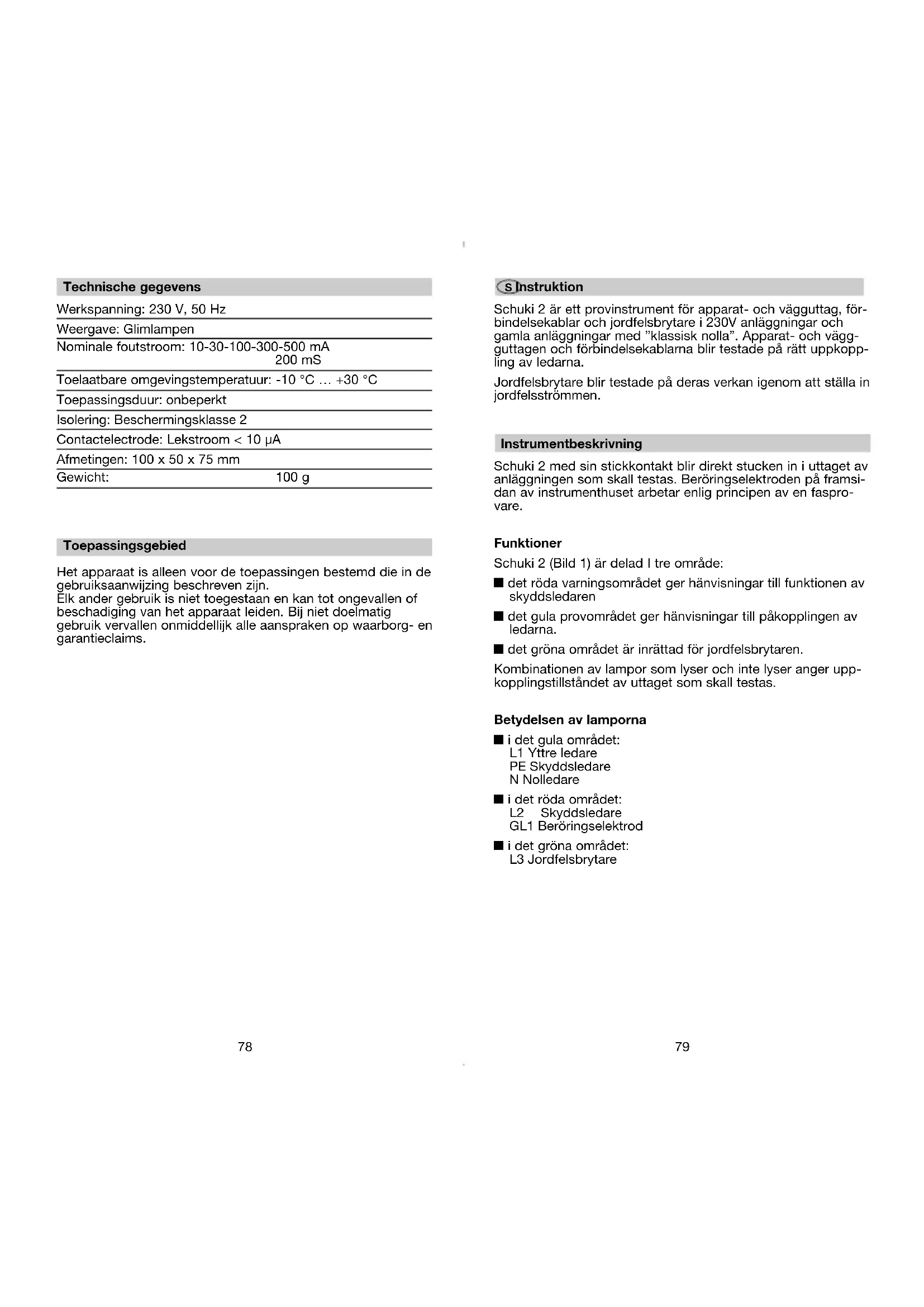 Afbeelding 11: Alle lampjes in het gele gebied branden. Bij indrukken van de knop T gaat bovendien L3 branden. Gelijktijdig gaat PE uit. Na in werking stellen van het FI-beschermingscircuit gaan alle lampjes uit. De beschermingsgeleider beschikt over een verhoogde, maar nog toelaatbare weerstand. Beschermingsgeleidersweerstand nog toelaatbaar R ~ ontoelaatbaar R ~ toelaatbaar Schuki 2 22.01.2004 15:49 Uhr Seite 7679 S Instruktion Schuki 2 är ett provinstrument för apparat- och vägguttag, för- bindelsekablar och jordfelsbrytare i 230V anläggningar och gamla anläggningar med ”klassisk nolla”. Apparat- och vägg- guttagen och förbindelsekablarna blir testade på rätt uppkopp- ling av ledarna. Jordfelsbrytare blir testade på deras verkan igenom att ställa in jordfelsströmmen. Instrumentbeskrivning Schuki 2 med sin stickkontakt blir direkt stucken in i uttaget av anläggningen som skall testas. Beröringselektroden på framsi- dan av instrumenthuset arbetar enlig principen av en faspro- vare. Funktioner Schuki 2 (Bild 1) är delad I tre område: y det röda varningsområdet ger hänvisningar till funktionen av skyddsledaren y det gula provområdet ger hänvisningar till påkopplingen av ledarna. y det gröna området är inrättad för jordfelsbrytaren. Kombinationen av lampor som lyser och inte lyser anger upp- kopplingstillståndet av uttaget som skall testas. Betydelsen av lamporna y i det gula området: L1 Yttre ledare PE Skyddsledare N Nolledare y i det röda området: L2 Skyddsledare GL1 Beröringselektrod y i det gröna området: L3 Jordfelsbrytare