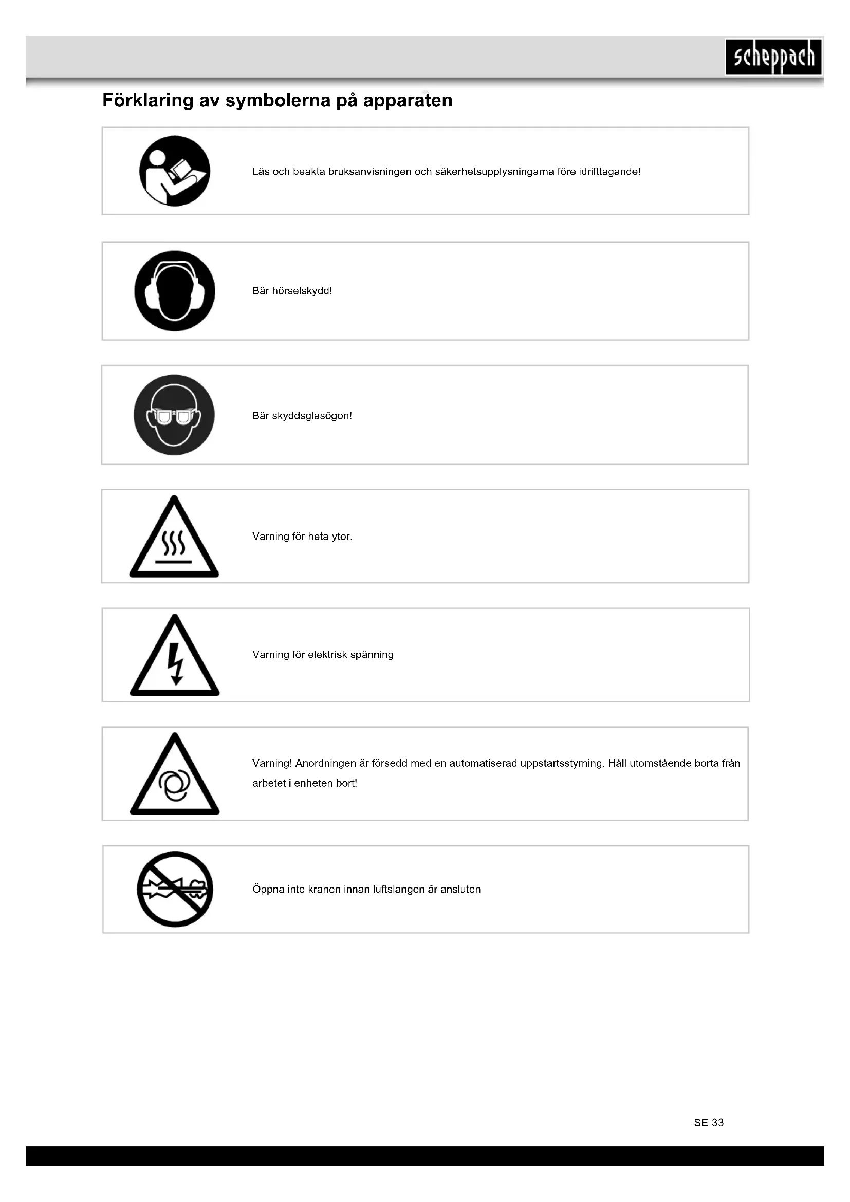 - Překontrolovat rychlospojku, event. vyměnit.SE 33 Förklaring av symbolerna på apparaten Läs och beakta bruksanvisningen och säkerhetsupplysningarna före idrifttagande! Varning för elektrisk spänning Varning! Anordningen är försedd med en automatiserad uppstartsstyrning. Håll utomstående borta från arbetet i enheten bort! Bär hörselskydd! Varning för heta ytor. Bär skyddsglasögon! Öppna inte kranen innan luftslangen är ansluten34 SE Maskinbeskrivning