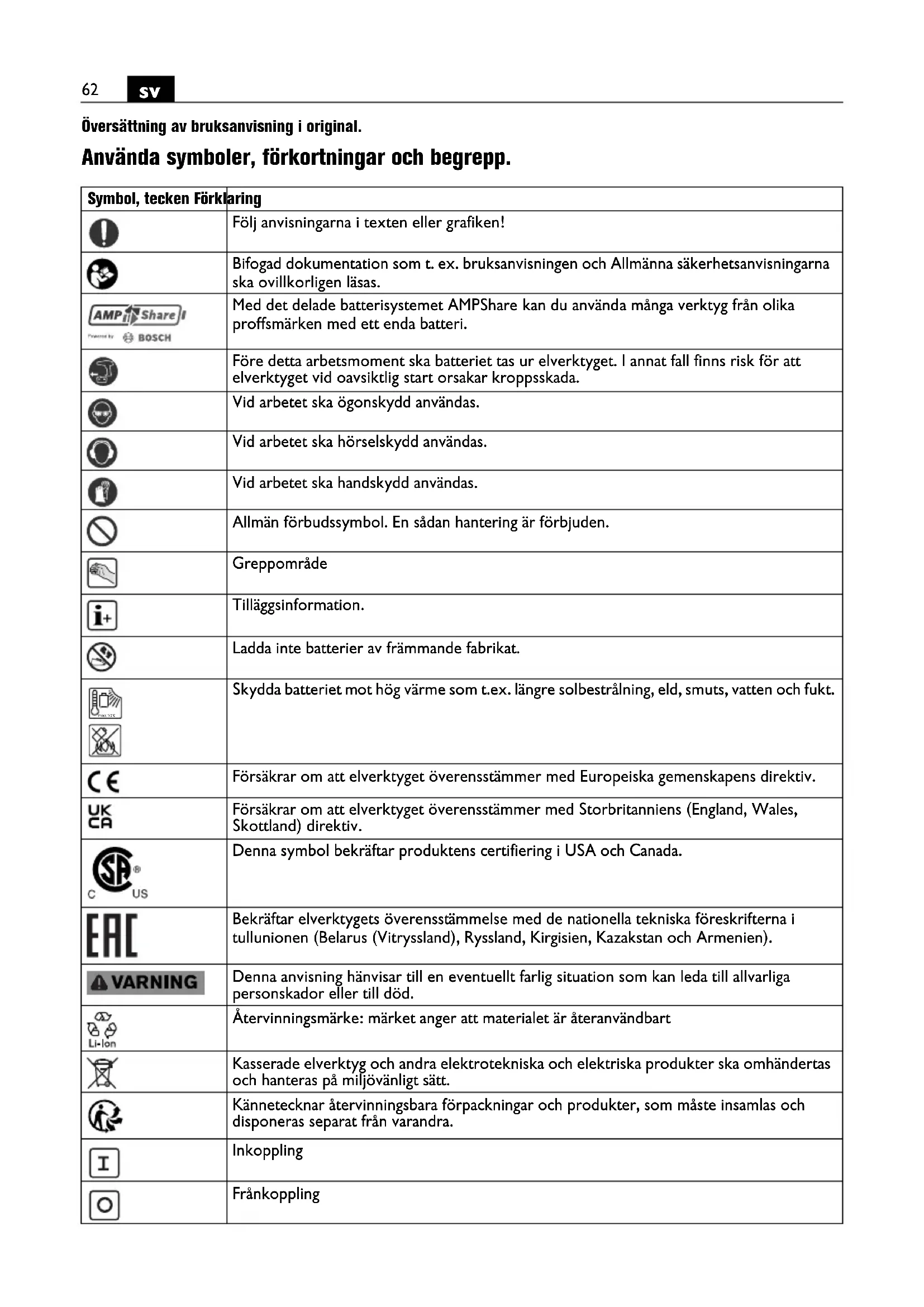 Översättning av bruksanvisning i original. Använda symboler, förkortningar och begrepp. Symbol, tecken Förklaring Följ anvisningarna i texten eller grafiken! Bifogad dokumentation som t. ex. bruksanvisningen och Allmänna säkerhetsanvisningarna ska ovillkorligen läsas. Med det delade batterisystemet AMPShare kan du använda många verktyg från olika proffsmärken med ett enda batteri. Före detta arbetsmoment ska batteriet tas ur elverktyget. I annat fall finns risk för att elverktyget vid oavsiktlig start orsakar kroppsskada. Vid arbetet ska ögonskydd användas. Vid arbetet ska hörselskydd användas. Vid arbetet ska handskydd användas. Allmän förbudssymbol. En sådan hantering är förbjuden. Greppområde Tilläggsinformation. Ladda inte batterier av främmande fabrikat. Skydda batteriet mot hög värme som t.ex. längre solbestrålning, eld, smuts, vatten och fukt. Försäkrar om att elverktyget överensstämmer med Europeiska gemenskapens direktiv. Försäkrar om att elverktyget överensstämmer med Storbritanniens (England, Wales, Skottland) direktiv. Denna symbol bekräftar produktens certifiering i USA och Canada. Bekräftar elverktygets överensstämmelse med de nationella tekniska föreskrifterna i tullunionen (Belarus (Vitryssland), Ryssland, Kirgisien, Kazakstan och Armenien). Denna anvisning hänvisar till en eventuellt farlig situation som kan leda till allvarliga personskador eller till död. Återvinningsmärke: märket anger att materialet är återanvändbart Kasserade elverktyg och andra elektrotekniska och elektriska produkter ska omhändertas och hanteras på miljövänligt sätt. Kännetecknar återvinningsbara förpackningar och produkter, som måste insamlas och disponeras separat från varandra. Inkoppling Frånkoppling max.50°C63