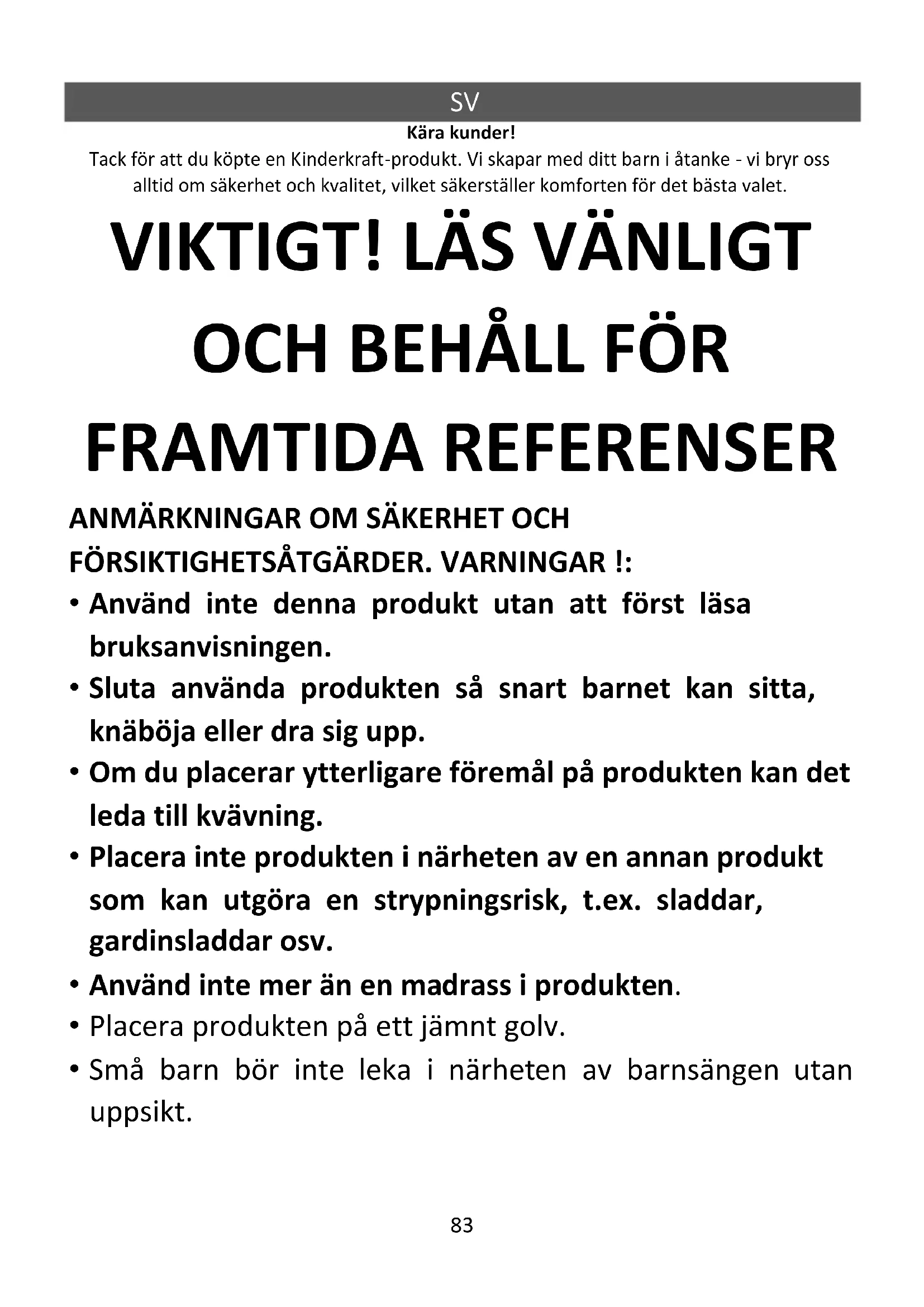 - Babyängen ska låsas i ett fast läge när barnet lämnas utan uppsikt.