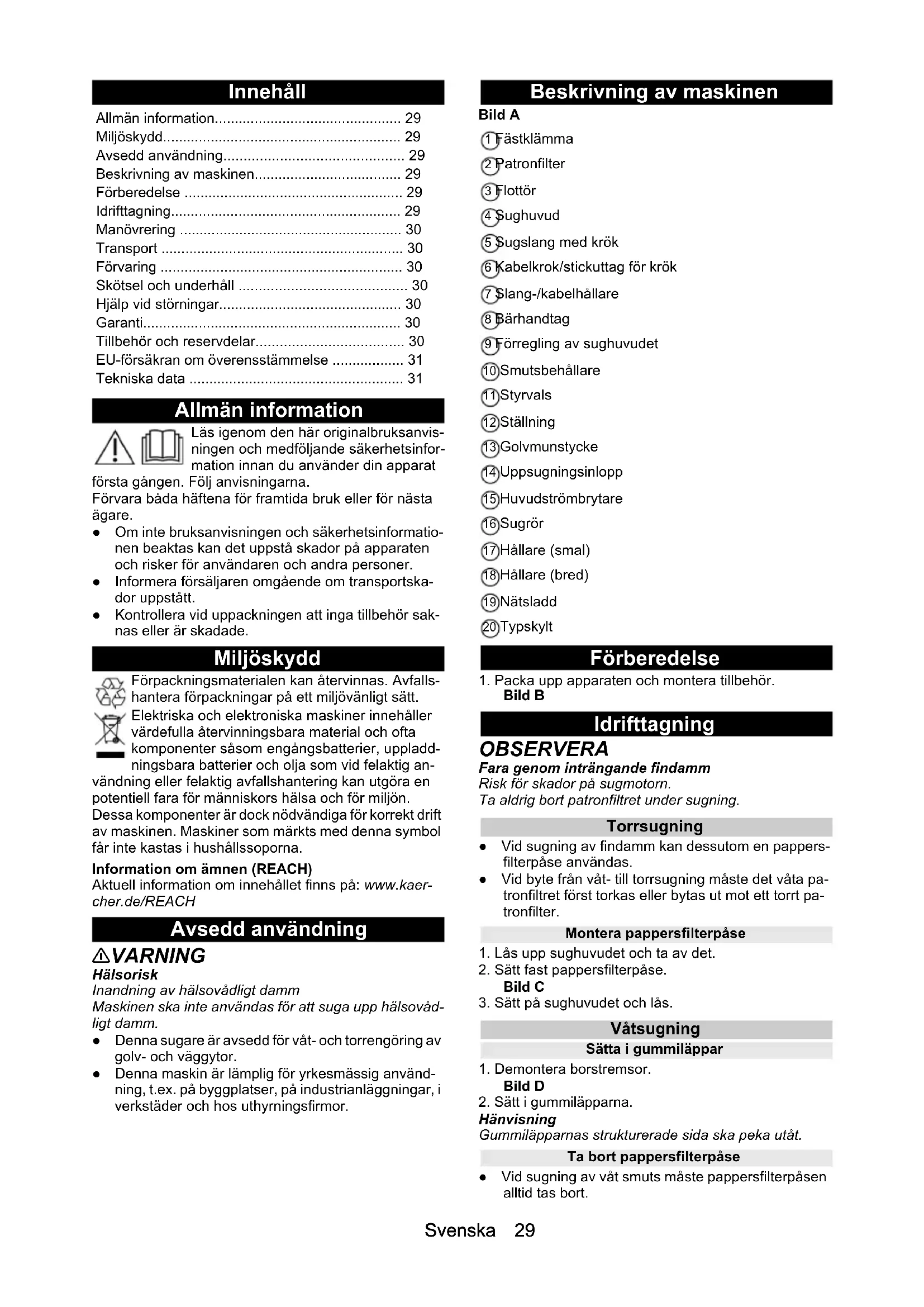 H05VV-F 2x1,0 H05VV-F 2x1,0 H05VV-F 2x1,0 Parça numarası (EU) 9.770-820.0 9.770-820.0 9.770-820.0 Kablo uzunluğu m 6,5 6,5 6,5Svenska 29 Innehåll Allmän information Läs igenom den här originalbruksanvis- ningen och medföljande säkerhetsinfor- mation innan du använder din apparat första gången. Följ anvisningarna. Förvara båda häftena för framtida bruk eller för nästa ägare. ● Om inte bruksanvisningen och säkerhetsinformatio- nen beaktas kan det uppstå skador på apparaten och risker för användaren och andra personer. ● Informera försäljaren omgående om transportska- dor uppstått. ● Kontrollera vid uppackningen att inga tillbehör sak- nas eller är skadade. Miljöskydd Förpackningsmaterialen kan återvinnas. Avfalls- hantera förpackningar på ett miljövänligt sätt. Elektriska och elektroniska maskiner innehåller värdefulla återvinningsbara material och ofta komponenter såsom engångsbatterier, uppladd- ningsbara batterier och olja som vid felaktig an- vändning eller felaktig avfallshantering kan utgöra en potentiell fara för människors hälsa och för miljön. Dessa komponenter är dock nödvändiga för korrekt drift av maskinen. Maskiner som märkts med denna symbol får inte kastas i hushållssoporna. Information om ämnen (REACH) Aktuell information om innehållet finns på: www.kaer- cher.de/REACH Avsedd användning 몇 VARNING Hälsorisk Inandning av hälsovådligt damm Maskinen ska inte användas för att suga upp hälsovåd- ligt damm. ● Denna sugare är avsedd för våt- och torrengöring av golv- och väggytor. ● Denna maskin är lämplig för yrkesmässig använd- ning, t.ex. på byggplatser, på industrianläggningar, i verkstäder och hos uthyrningsfirmor. Beskrivning av maskinen Bild A 1 Fästklämma 2 Patronfilter 3 Flottör 4 Sughuvud 5 Sugslang med krök 6 Kabelkrok/stickuttag för krök 7 Slang-/kabelhållare 8 Bärhandtag 9 Förregling av sughuvudet 10 Smutsbehållare 11 Styrvals 12 Ställning 13 Golvmunstycke 14 Uppsugningsinlopp 15 Huvudströmbrytare 16 Sugrör 17 Hållare (smal) 18 Hållare (bred) 19 Nätsladd 20 Typskylt Förberedelse