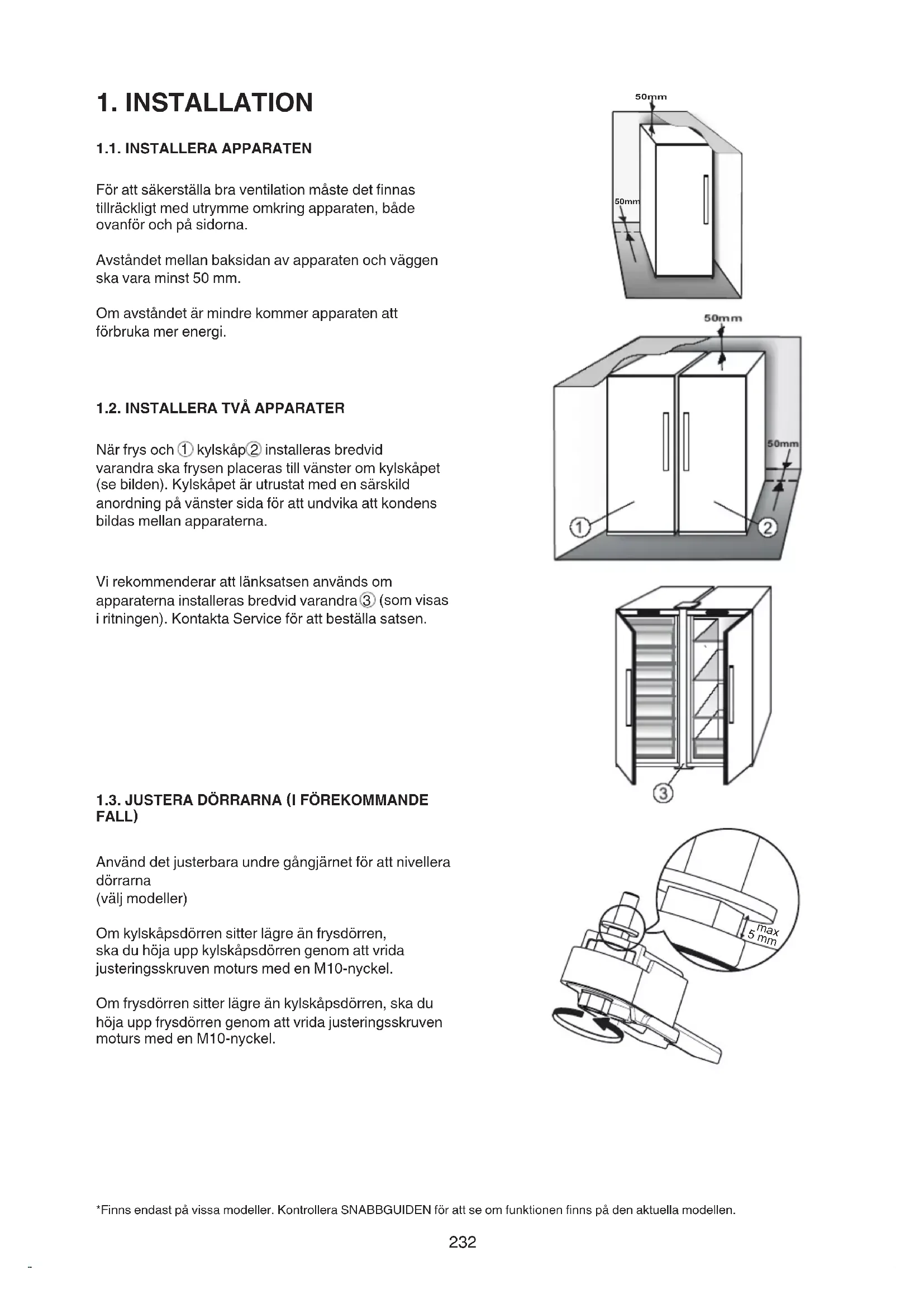FALL) Använd det justerbara undre gångjärnet för att nivellera dörrarna (väljmodeller) Omkylskåpsdörrensitterlägreänfrysdörren, ska du höja upp kylskåpsdörren genom att vrida justeringsskruvenmotursmedenM10-nyckel. Omfrysdörrensitterlägreänkylskåpsdörren,skadu höja upp frysdörren genom att vrida justeringsskruven motursmedenM10-nyckel. *Finnsendastpåvissamodeller.KontrolleraSNABBGUIDENförattseomfunktionenfinnspådenaktuellamodellen. 50mm 50mm 5 mm max233
