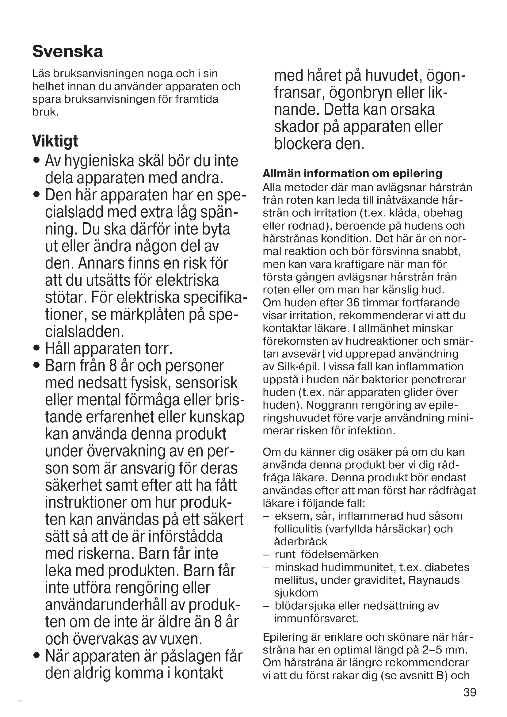 När apparaten är påslagen får den aldrig komma i kontakt med håret på huvudet, ögon- fransar, ögonbryn eller lik- nande. Detta kan orsaka skador på apparaten eller blockera den. Allmän information om epilering Alla metoder där man avlägsnar hårstrån från roten kan leda till inåtväxande hår- strån och irritation (t.ex. klåda, obehag eller rodnad), beroende på hudens och hårstrånas kondition. Det här är en nor- mal reaktion och bör försvinna snabbt, men kan vara kraftigare när man för första gången avlägsnar hårstrån från roten eller om man har känslig hud. Om huden efter 36 timmar fortfarande visar irritation, rekommenderar vi att du kontaktar läkare. I allmänhet minskar förekomsten av hudreaktioner och smär- tan avsevärt vid upprepad användning av Silk·épil. I vissa fall kan inflammation uppstå i huden när bakterier penetrerar huden (t.ex. när apparaten glider över huden). Noggrann rengöring av epile- ringshuvudet före varje användning mini- merar risken för infektion. Om du känner dig osäker på om du kan använda denna produkt ber vi dig råd- fråga läkare. Denna produkt bör endast användas efter att man först har rådfrågat läkare i följande fall: – eksem, sår, inflammerad hud såsom folliculitis (varfyllda hårsäckar) och åderbråck – runt födelsemärken – minskad hudimmunitet, t.ex. diabetes mellitus, under graviditet, Raynauds sjukdom – blödarsjuka eller nedsättning av immunförsvaret. Epilering är enklare och skönare när hår- stråna har en optimal längd på 2–5 mm. Om hårstråna är längre rekommenderar vi att du först rakar dig (se avsnitt B) och Svenska 91618385_SE_3273_3274_GROCERY_S6-60.indd 3991618385_SE_3273_3274_GROCERY_S6-60.indd 39 22.08.17 08:3022.08.17 08:30 CSS APPROVED Effective Date 25Aug2017 GMT - Printed 22Nov2017 Page 39 of 6040 epilerar de kortare, utvuxna hårstråna en vecka senare. Fina, återväxande hårstrån kanske inte når upp till hudens yta. Regelbunden användning av massagesvampar (t.ex. efter duschen) eller exfolierande peeling hjälper till att förhindra inåtväxande hårstrån eftersom skrubbning avlägsnar det övre hudlagret och fina hårstrån kan ta sig genom hudens yta. Beskrivning 1 Masserande rullar 2 Epileringshuvud med pincettdel 3 Frigörningsknappar 4 På-/av-brytare med inbyggd lampa 5 Kontakt 6 Specialsladd 7 Rakhuvudtillbehör med trimmerkåpa A Hur man epilerar