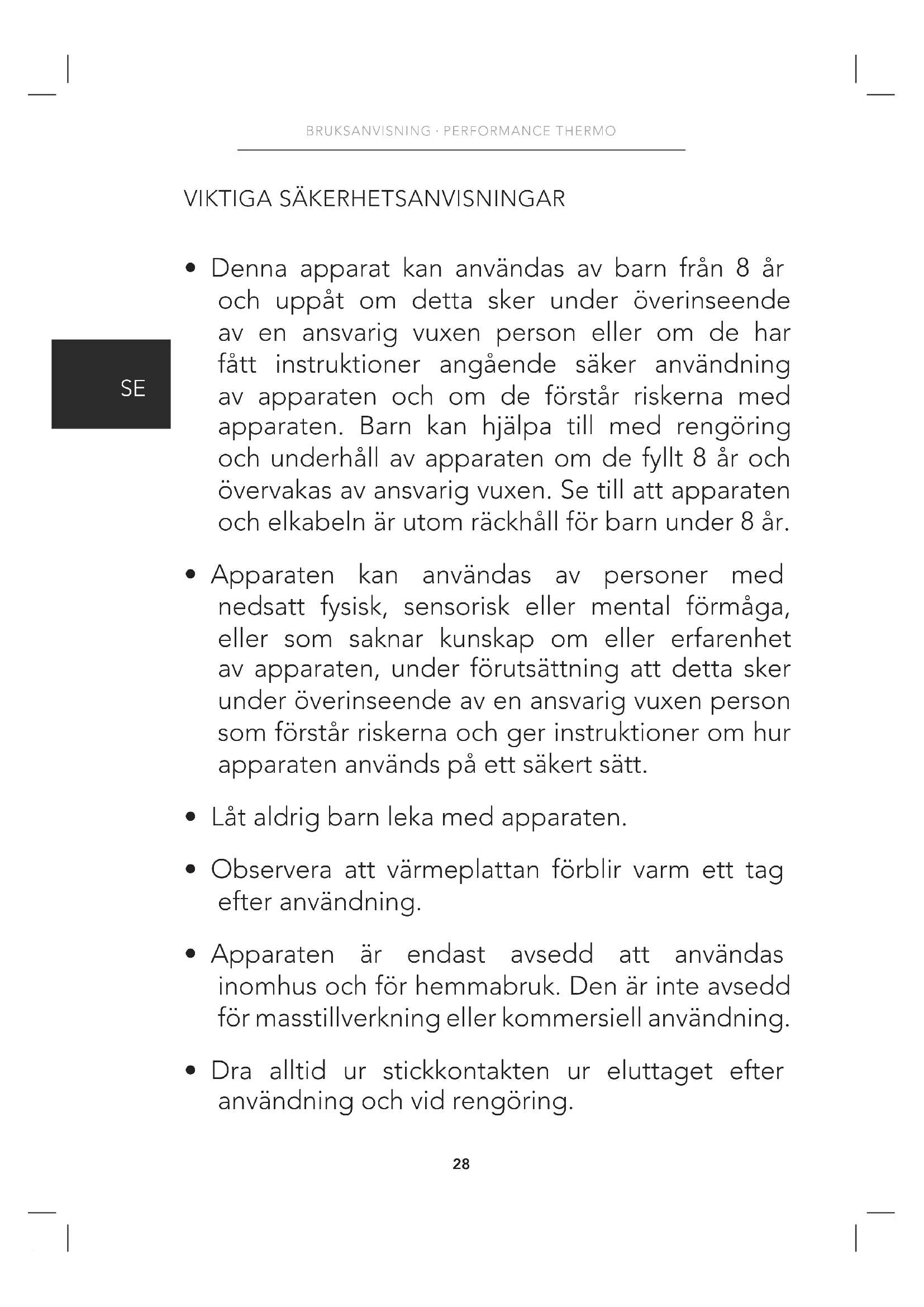 - Denna apparat kan användas av barn från 8 år och uppåt om detta sker under överinseende av en ansvarig vuxen person eller om de har fått instruktioner angående säker användning av apparaten och om de förstår riskerna med apparaten. Barn kan hjälpa till med rengöring och underhåll av apparaten om de fyllt 8 år och övervakas av ansvarig vuxen. Se till att apparaten och elkabeln är utom räckhåll för barn under 8 år.