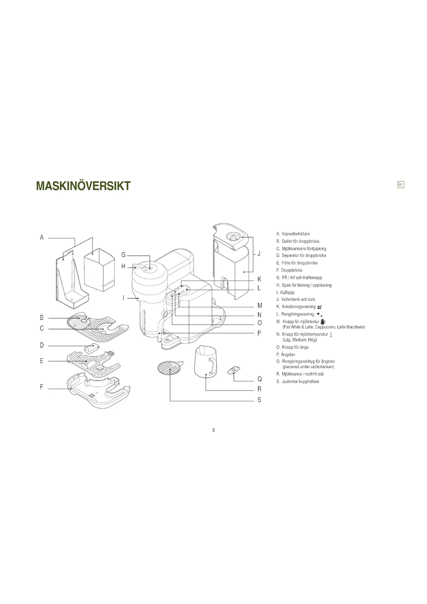 MASKINÖVERSIKT A. Kapselbehållare B. Galler för droppbricka C. Mjölkkannans fördjupning D. Separator för droppbricka E. Flöte för droppbricka F. Droppbricka G. PÅ / AV och Kaeknapp H. Spak för låsning / upplåsning