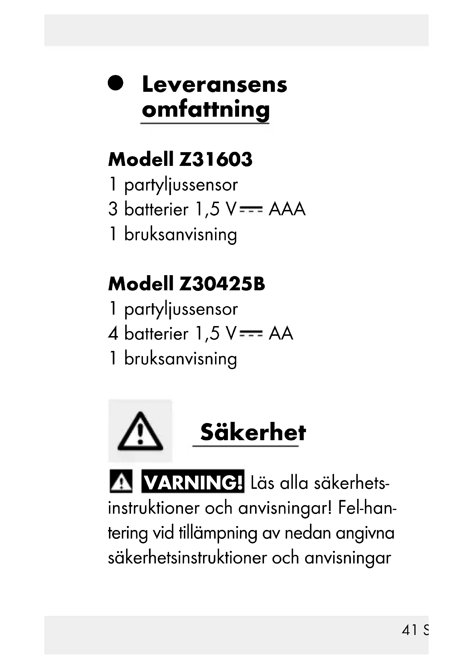 BARN! Låt inte barn leka med förpackningsmaterialet. Kväv- ningsrisk föreligger vid hantering av förpackningsmaterialet. Mindre barn förstår inte farorna som lurar.43 SE Denna produkt är ingen leksak och skall inte hanteras av barn. Mindre barn förstår inte farorna som lurar i samband med dylika produkter. Denna apparat kan användas av barn från och med 8 år samt av personer med nedsatt fysisk, mo- torisk eller mental förmåga eller med bristande erfarenhet och kunskap, om de hålls under upp- sikt eller instruerats om en säker användning av apparaten och om de förstått de risker som an- vändningen kan medföra. Barn får inte leka med apparaten. Rengöring och underhåll får inte utföras av barn utan uppsikt av vuxen person. VARNING! LIVSFARA! Batterier är lätta att svälja vilket44 SE innebär livsfara. Uppsök omedelbart läkare om någon svalt ett batteri. Använd aldrig en produkt som är skadad. Använd endast produkten i slutna rum. Produkten är inte avsedd för användning utomhus. Produkten får inte utsättas för vatten och fukt. Risk för skador. Säkerhets- anvisningar för batterier Ta ur batterierna om produkten inte skall användas under längre tid. OBSERVERA! EXPLOSIONS- RISK! Ladda aldrig batterierna!45 SE Kontrollera att batteripolerna ligger åt rätt håll. Dessa visas i batterifacken. Rengör batteri- och apparatkon- takter om nödvändigt. Byt alltid alla batterier samtidigt och lägg in batterier av samma typ. Använd inte olika typer eller tomma och nya batterier tillsammans. Ta omedelbart bort ett tomt bat- teri ur produkten. Risk för att bat- teriet läcker föreligger. Om detta inte beaktas kan batteriet laddas ur utöver före- kommande spänning. Risk för läckage föreligger. Om batteriet läcker inne i produkten, ta ur det omedelbart för att undvika skador på produkten.46 SE Kasta inte batterierna i hushålls- soporna. Varje användare är förpliktad att avfallshanteras batterier enligt gällande miljöregler. Se till att barn inte handskas med batterierna, kasta inte batterierna i öppen eld, batterierna får inte kortslutas eller öppnas. Undvik kontakt med huden, ögo- nen och slemhinnor. Spola ome- delbart av den plats som kommit i kontakt med batterisyran, använd rent vatten och uppsök läkare.47 SE
