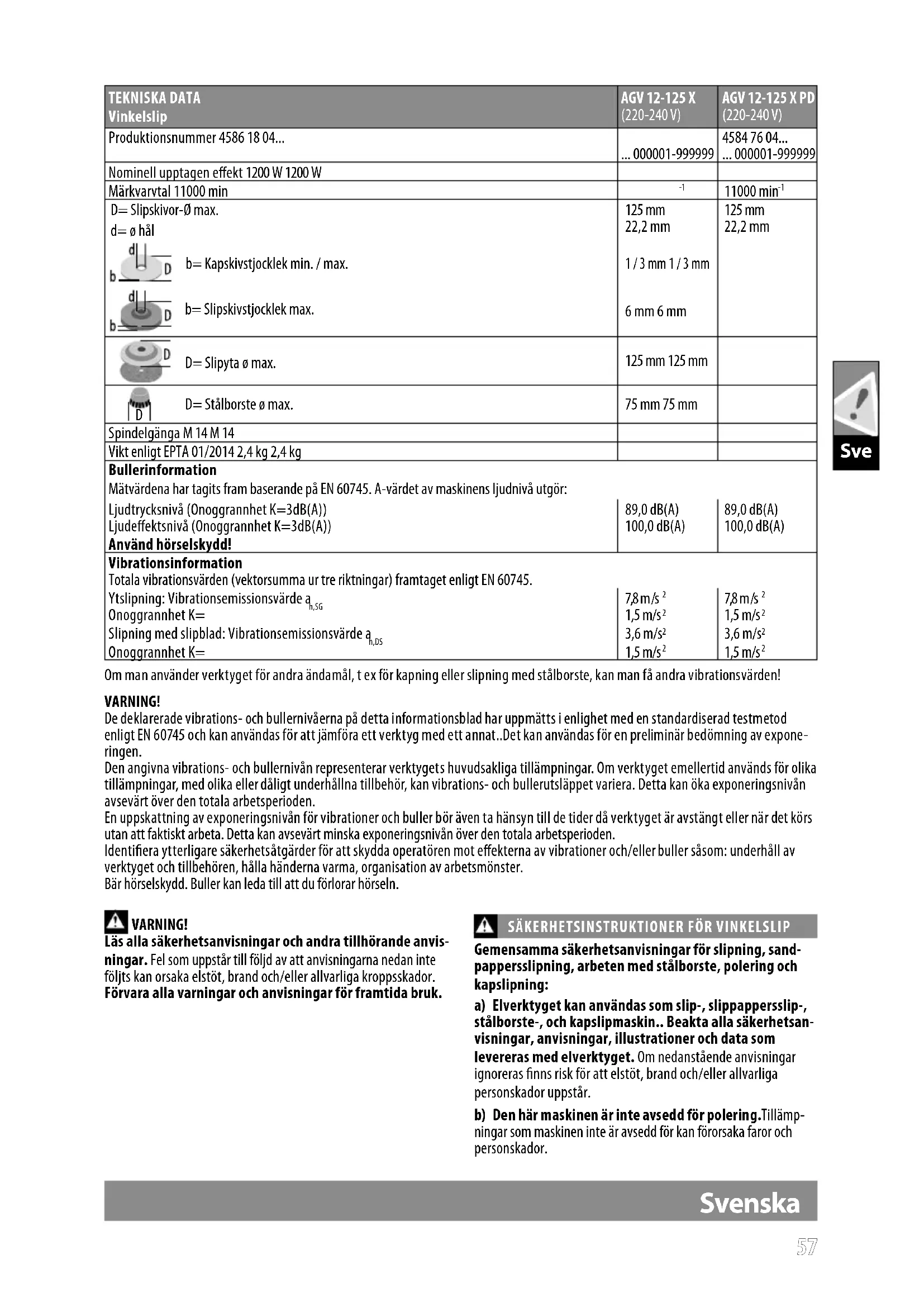 Om man använder verktyget för andra ändamål, t ex för kapning eller slipning med stålborste, kan man få andra vibrationsvärden! VARNING! De deklarerade vibrations- och bullernivåerna på detta informationsblad har uppmätts i enlighet med en standardiserad testmetod enligt EN 60745 och kan användas för att jämföra ett verktyg med ett annat..Det kan användas för en preliminär bedömning av expone- ringen. Den angivna vibrations- och bullernivån representerar verktygets huvudsakliga tillämpningar. Om verktyget emellertid används för olika tillämpningar, med olika eller dåligt underhållna tillbehör, kan vibrations- och bullerutsläppet variera. Detta kan öka exponeringsnivån avsevärt över den totala arbetsperioden. En uppskattning av exponeringsnivån för vibrationer och buller bör även ta hänsyn till de tider då verktyget är avstängt eller när det körs utan att faktiskt arbeta. Detta kan avsevärt minska exponeringsnivån över den totala arbetsperioden. Identiera ytterligare säkerhetsåtgärder för att skydda operatören mot eekterna av vibrationer och/eller buller såsom: underhåll av verktyget och tillbehören, hålla händerna varma, organisation av arbetsmönster. Bär hörselskydd. Buller kan leda till att du förlorar hörseln. VARNING! Läs alla säkerhetsanvisningar och andra tillhörande anvis- ningar. Fel som uppstår till följd av att anvisningarna nedan inte följts kan orsaka elstöt, brand och/eller allvarliga kroppsskador. Förvara alla varningar och anvisningar för framtida bruk.