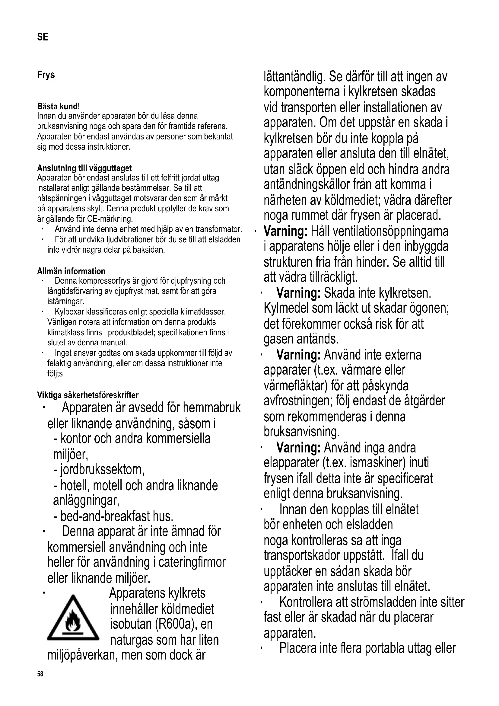 Apparatens kylkrets innehåller köldmediet isobutan (R600a), en naturgas som har liten miljöpåverkan, men som dock är lättantändlig. Se därför till att ingen av komponenterna i kylkretsen skadas vid transporten eller installationen av apparaten. Om det uppstår en skada i kylkretsen bör du inte koppla på apparaten eller ansluta den till elnätet, utan släck öppen eld och hindra andra antändningskällor från att komma i närheten av köldmediet; vädra därefter noga rummet där frysen är placerad. ∙ Varning: Håll ventilationsöppningarna i apparatens hölje eller i den inbyggda strukturen fria från hinder. Se alltid till att vädra tillräckligt. ∙ Varning: Skada inte kylkretsen. Kylmedel som läckt ut skadar ögonen; det förekommer också risk för att gasen antänds. ∙ Varning: Använd inte externa apparater (t.ex. värmare eller värmeäktar) för att påskynda avfrostningen; följ endast de åtgärder som rekommenderas i denna bruksanvisning. ∙ Varning: Använd inga andra elapparater (t.ex. ismaskiner) inuti frysen ifall detta inte är specicerat enligt denna bruksanvisning. ∙ Innan den kopplas till elnätet bör enheten och elsladden noga kontrolleras så att inga transportskador uppstått. Ifall du upptäcker en sådan skada bör apparaten inte anslutas till elnätet. ∙ Kontrollera att strömsladden inte sitter fast eller är skadad när du placerar apparaten. ∙ Placera inte era portabla uttag eller59 142 x 208 mm portabla nätaggregat på baksidan av apparaten. ∙ Denna apparat är inte ämnad för förvaring av explosiva ämnen såsom sprayaskor med ett lättantändligt drivmedel. ∙ Om enheten är såld, överlåten till tredje part eller lämnad till en lämplig återvinningsstation bör man observera att apparaten innehåller blåsmedlet ’cyclopentan’ C5H10 samt frysmediet R600a. Mer information om korrekt återvinning hittar du i avsnittet Bortskaffning. ∙ Följ säkerhetsföreskrifterna och undvik risker genom att låta behörig servicepersonal utföra reparationer eller ändringar beträffande denna apparat, inklusive byte av elsladd. ∙ Denna apparat kan användas av barn (minst 8 år gamla) och av personer som har minskad fysisk rörelseförmåga, reducerat sinnes- eller mentaltillstånd, eller som har bristfällig erfarenhet och kunskap, förutsatt att dessa personer är under uppsyn eller har fått tillräckliga instruktioner beträffande apparatens användning och vet vilka risker och säkerhetsåtgärder som användningen innefattar. ∙ Barn i åldrarna 3 till 8 år är tillåtna att lasta och lossa kylapparater. ∙ Barn bör inte tillåtas leka med apparaten. ∙ Barn bör inte tillåtas rengöra eller underhålla apparaten utan övervakning. ∙ För alldaglig rengöring rekommenderar vi att varmt vatten och ett milt rengöringsmedel används. Se avsnittet Avfrostning och rengöring för detaljerad information om hur apparaten bör rengöras. För att undvika förorening av mat respektera följande instruktioner: ∙ Öppning av dörren under långa perioder kan orsaka en signikant ökning av temperaturen i apparatens fack. ∙ Rengör regelbundet ytor som kan komma i kontakt med mat och tillgängliga avloppssystem. ∙ Om kylapparaten lämnas tom under långa perioder, stäng av, avfrosta, rengör, torka och låt dörren stå öppen för att förhindra mögelutveckling i apparaten. ∙ För att undvika risken för personlig skada eller skador på frysen, bör frysen endast transporteras i dess originalemballage. För uppackning och installation krävs 2 personer. ∙ Varning: Håll barn på avstånd från apparatens förpackningsmaterial eftersom fara eventuellt kan uppstå. Det nns t.ex. risk för kvävning. ∙ Isen som du avlägsnar ur enheten vid avfrostningen lämpar sig inte för mänsklig konsumtion. ∙ Kontrollera regelbundet att elsladden inte blivit skadad. Om sladden har skadats får apparaten inte längre användas. ∙ På grund av brandrisken bör du inte placera elektriska apparater ovanpå frysen. Placera inte behållare innehållande vätska ovanpå enheten. Härigenom undviker du eventuellt läckage eller att läckande vätska skadar den elektriska isoleringen. ∙ Denna enhet är endast ämnad för förvaring av livsmedel. ∙ Ämnen som innehåller alkohol bör bevaras i väl tillslutna behållare och placeras i upprätt position. ∙ Förvara inte glasaskor innehållande kolsyrade eller andra frysbara vätskor i frysen: sådana askor kan spricka under frysprocessen. ∙ Undvik risken för matförgiftning genom att inte äta mat som förvarats för länge. Upptinad mat får inte frysas på nytt.60 142 x 208 mm ∙ Luta dig inte mot eller lägg oskälig vikt på hyllorna, förvaringsbackarna, dörren etc. ∙ Skydda alltid frysens insida från öppen eld och andra antändningskällor. ∙ Dra alltid stickproppen ur vägguttaget - om apparaten skulle uppvisa fel, - före avfrostning, - före rengöring, - innan service eller reparation påbörjas. ∙ Ta stickproppen ur vägguttaget genom att dra i stickproppen, aldrig i sladden. ∙ Om inte enheten används under en lång tid rekommenderar vi att dörren hålls öppen. ∙ Vi förbehåller oss rätten att introducera tekniska modikationer. Delar