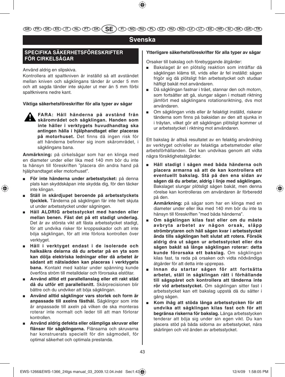 Svenska Ytterligare säkerhetsföreskrifter för alla typer av sågar