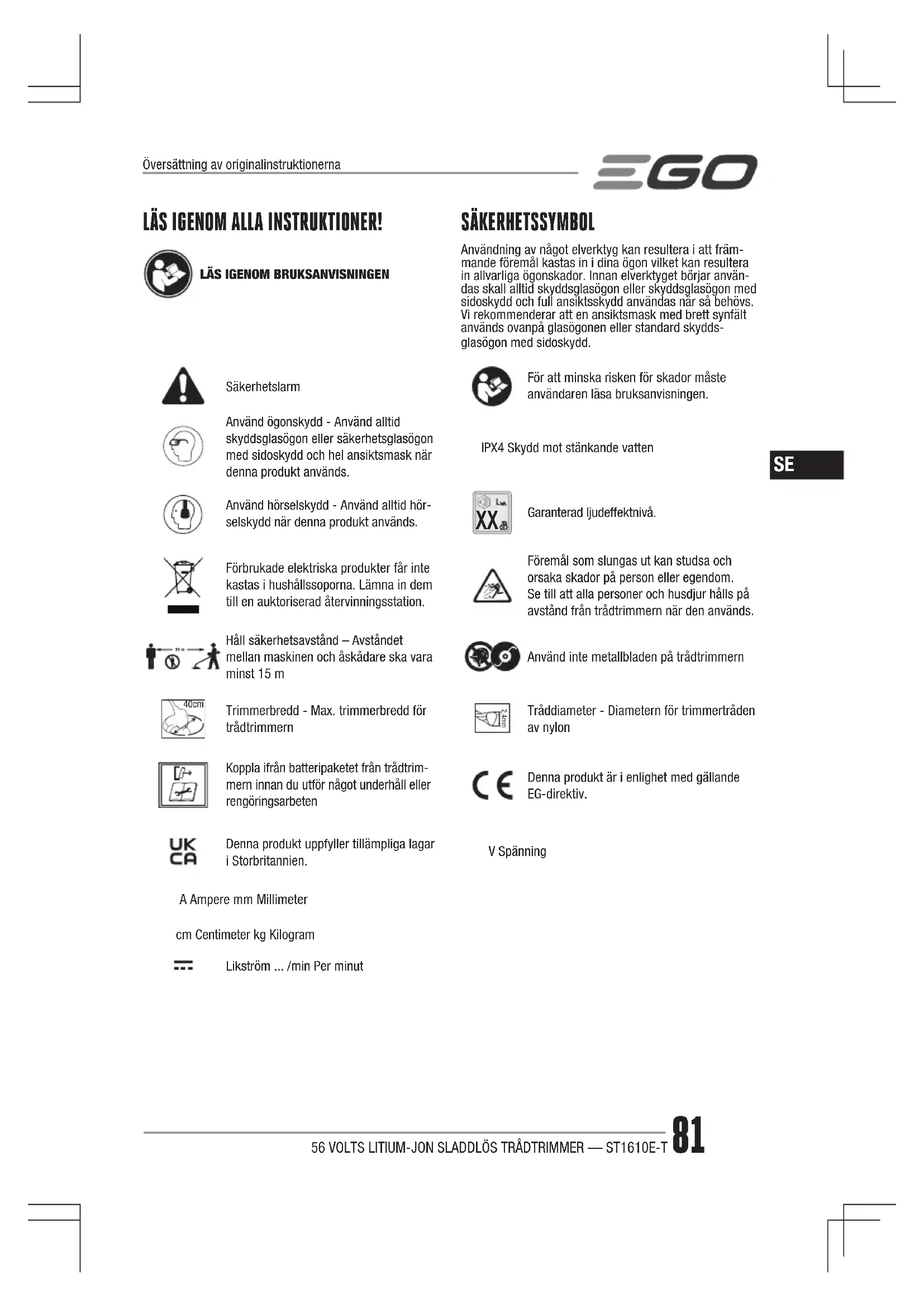 Garanterad ljudeffektnivå.Förbrukade elektriska produkter får inte kastas i hushållssoporna. Lämna in dem till en auktoriserad återvinningsstation.Föremål som slungas ut kan studsa och orsaka skador på person eller egendom. Se till att alla personer och husdjur hålls på avstånd från trådtrimmern när den används. Håll säkerhetsavstånd – Avståndet mellan maskinen och åskådare ska vara minst 15 mAnvänd inte metallbladen på trådtrimmern 40cm Trimmerbredd - Max. trimmerbredd för trådtrimmern 2.4mmTråddiameter - Diametern för trimmertråden av nylonKoppla ifrån batteripaketet från trådtrim-mern innan du utför något underhåll eller rengöringsarbeten Denna produkt är i enlighet med gällande EG-direktiv.Denna produkt uppfyller tillämpliga lagar i Storbritannien.V SpänningA Ampere mm Millimetercm Centimeter kg KilogramLikström ... /min Per minut56 VOLTS LITIUM-JON SLADDLÖS TRÅDTRIMMER — ST1610E-T82