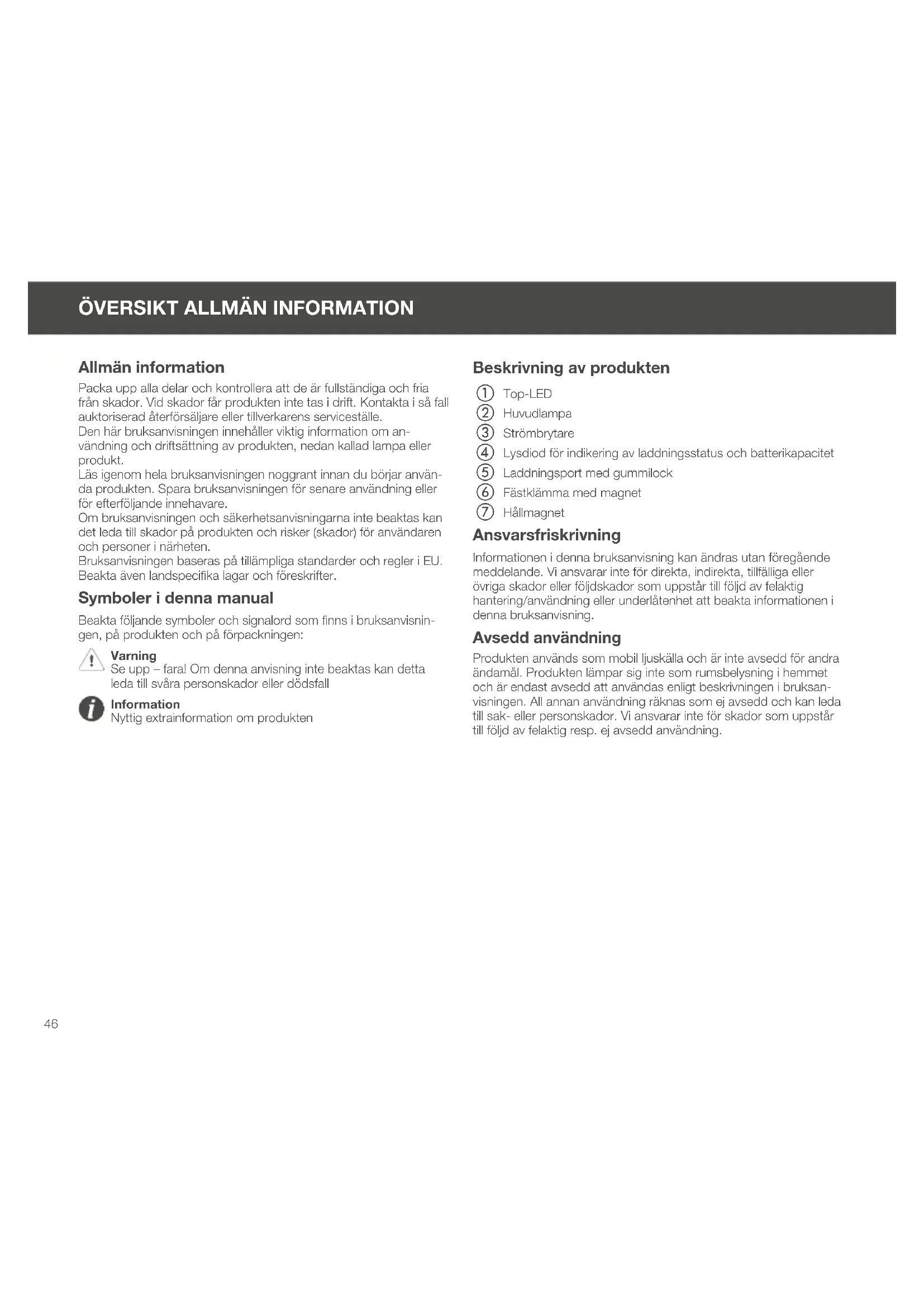 Allmän information Packa upp alla delar och kontrollera att de är fullständiga och fria från skador. Vid skador får produkten inte tas i drift. Kontakta i så fall auktoriserad återförsäljare eller tillverkarens serviceställe. Den här bruksanvisningen innehåller viktig information om an- vändning och driftsättning av produkten, nedan kallad lampa eller produkt. Läs igenom hela bruksanvisningen noggrant innan du börjar använ- da produkten. Spara bruksanvisningen för senare användning eller för efterföljande innehavare. Om bruksanvisningen och säkerhetsanvisningarna inte beaktas kan det leda till skador på produkten och risker (skador) för användaren och personer i närheten. Bruksanvisningen baseras på tillämpliga standarder och regler i EU. Beakta även landspecika lagar och föreskrifter. Symboler i denna manual Beakta följande symboler och signalord som nns i bruksanvisnin- gen, på produkten och på förpackningen: Varning Se upp – fara! Om denna anvisning inte beaktas kan detta leda till svåra personskador eller dödsfall Information Nyttig extrainformation om produkten Beskrivning av produkten a.Top-LED b.Huvudlampa c.Strömbrytare d.Lysdiod för indikering av laddningsstatus och batterikapacitet e.Laddningsport med gummilock f.Fästklämma med magnet g.Hållmagnet Ansvarsfriskrivning Informationen i denna bruksanvisning kan ändras utan föregående meddelande. Vi ansvarar inte för direkta, indirekta, tillfälliga eller övriga skador eller följdskador som uppstår till följd av felaktig hantering/användning eller underlåtenhet att beakta informationen i denna bruksanvisning. Avsedd användning Produkten används som mobil ljuskälla och är inte avsedd för andra ändamål. Produkten lämpar sig inte som rumsbelysning i hemmet och är endast avsedd att användas enligt beskrivningen i bruksan- visningen. All annan användning räknas som ej avsedd och kan leda till sak- eller personskador. Vi ansvarar inte för skador som uppstår till följd av felaktig resp. ej avsedd användning.SV