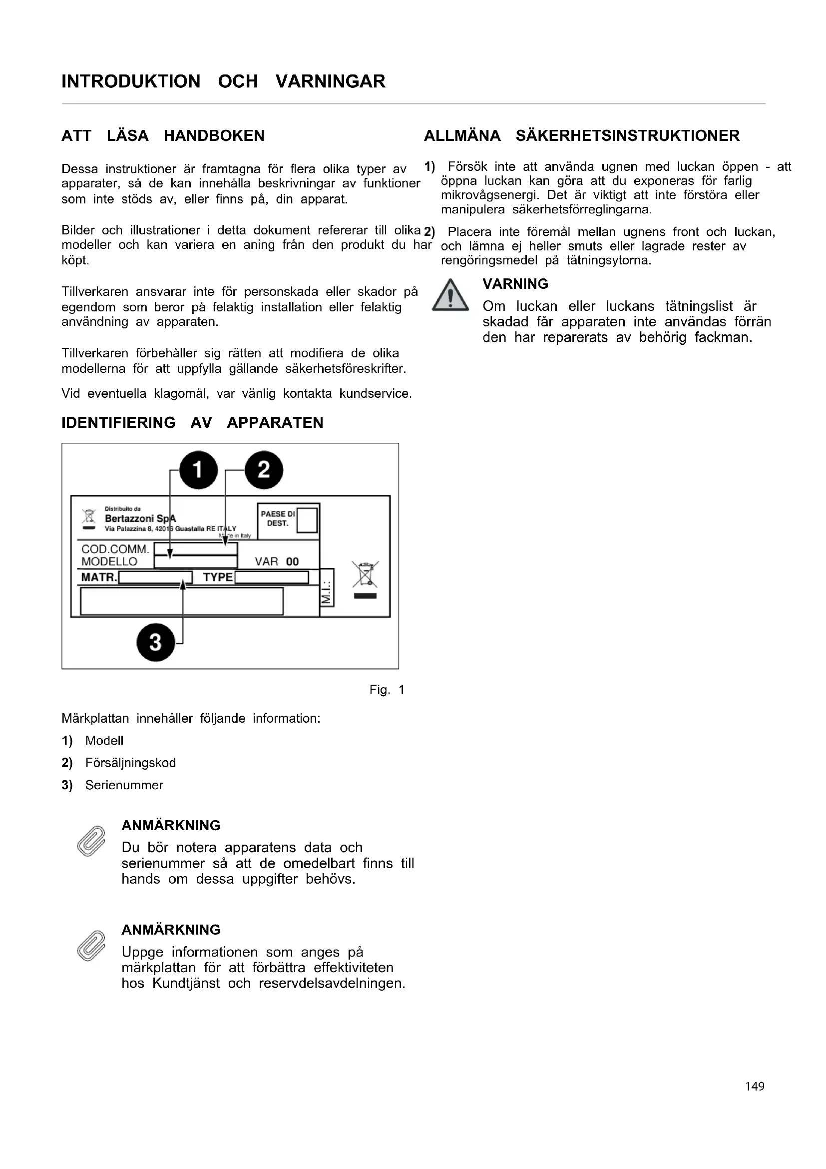 Bäste ägare till en Bertazzoni-apparat, Tack för att du har valt en av våra kvalitetsapparater till ditt hem. Min familj har tillverkat spisar i Italien sedan 1882 och under vägen har vi skaffat oss ett grundmurat gott rykte för våra utmärkta tekniska produkter - något som fötts ur vår passion för god mat. Våra produkter stoltserar idag med en exklusiv och typiskt italiensk design i absolut teknisk toppnivå. Vår mission är att tillverka hushållsapparater som fungerar perfekt och som skänker glädje åt den som använder dem. Vi svarar på våra kunders behov genom att tillverka produkter med mycket höga estetiska värden. Våra hushållsapparater är dessutom mångsidiga och lättanvända, så att laga mat med dem blir till ett rent nöje. Denna handbok kommer att hjälpa dig att lära dig att ta hand om din Bertazzoniprodukt på allra bästa och säkraste vis, så att du kan få full tillfredsställelse då du använder den i många, många år. Njut! Paolo Bertazzoni Verkställande Direktör