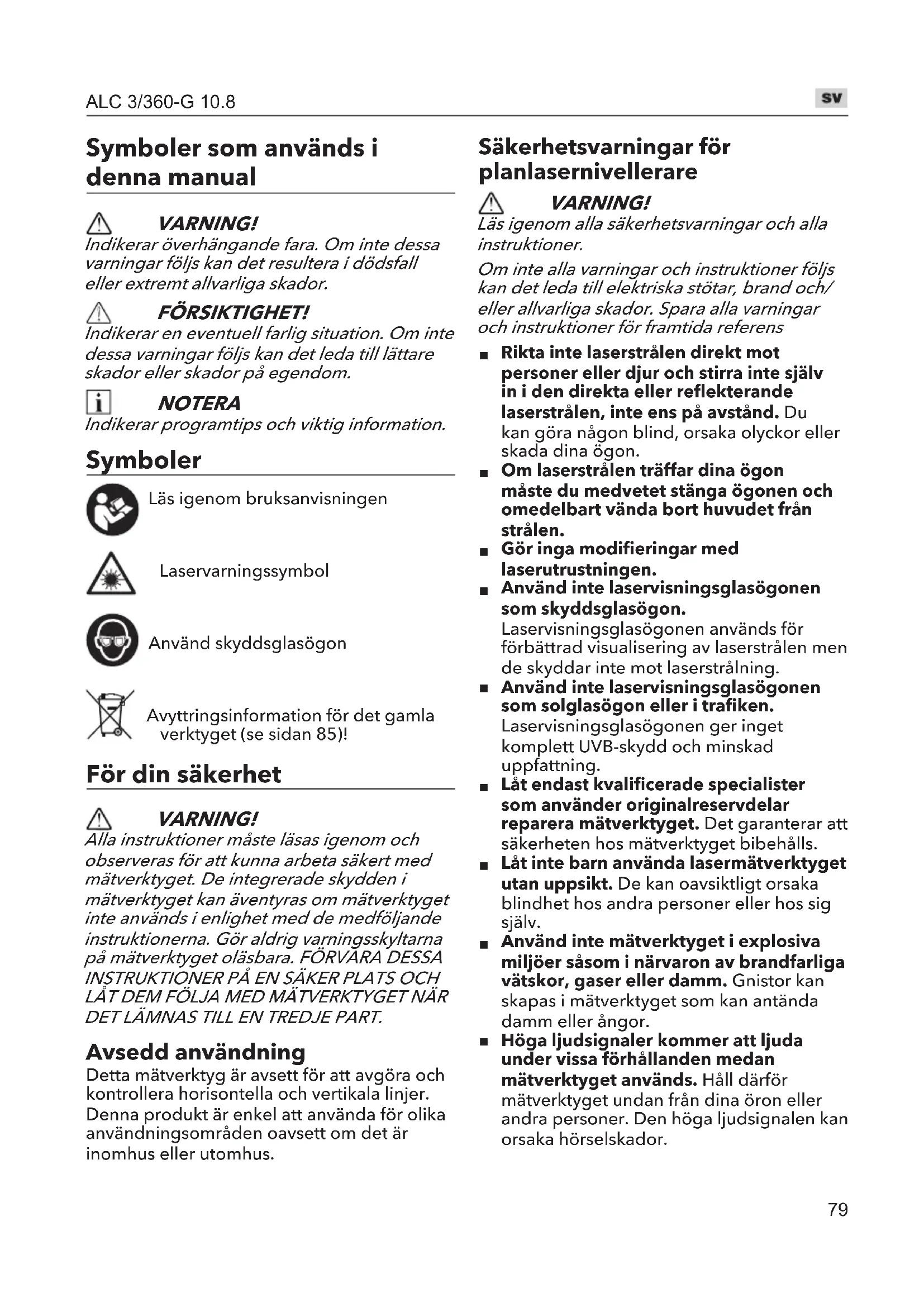 Ikke prøv å reparere eller demontere produktet. Enhver reparasjon eller demontering som kreves på dette produktet skal kun utføres av autorisert servicepersonell, ellers kan alvorlig personskade oppstå. Reservedeler og tilbehør Forstørrede tegninger og lister over reservedeler finner du på hjemmesiden vår: www.flex-tools.com Informasjon om avfallshåndtering ADVARSEL! Gjør overflødige verktøy ubrukelige: nettdrevet verktøy ved å ta ut strømledningen, batteridrevet verktøy ved å fjerne batteriet. Kun EU-landIkke kast elektroverktøy med husholdningsavfall!I samsvar med det europeiske direktivet 2012/19 / EC om avfall elektrisk og elektronisk utstyr og innføring i nasjonal lovgivning må elektriske verktøy samles inn separat og resirkuleres på en miljøvennlig måte.Gjenvinning av råvarer i stedet for avfallshåndtering. Enheten, tilbehøret og emballasjen skal resirkuleres på en miljøvennlig måte. Plastdeler er identifisert for resirkulering etter materialtype. ADVARSEL! Ikke kast batterier i husholdningsavfall, ild eller vann. Ikke åpne brukte batterier. Kun EU-land:I henhold til direktiv 2006/66/EF må defekte eller brukte batterier resirkuleres. MERK Spør forhandleren din om hvilke alternativer du har for avfallshåndtering! - Samsvarserklæring Vi erklærer på eget ansvar at produktet som er beskrevet under “Tekniske spesifikasjoner”, overholder følgende standarder eller normative dokumenter:EN 60745 i samsvar med forskriftene i direktivene 2014/30 / EC, 2006/42 / EC, 2011/65 / EC.Ansvarlig for tekniske dokumenter: FLEX-Elektrowerkzeuge GmbH, R & DBahnhofstrasse 15, D-71711 Steinheim/Murr Peter Lameli Klaus Peter WeinperTechnical Head Head of Quality Department (QD)01.01.2021; FLEX-Elektrowerkzeuge GmbH Bahnhofstrasse 15, D-71711 Steinheim/Murr Fritak fra ansvar Produsenten og hans representant er ikke ansvarlig for skader og tapt fortjeneste på grunn av avbrudd i virksomheten forårsaket av produktet eller av et ubrukbart produkt. Produsenten og hans representant er ikke ansvarlig for skader som er forårsaket av feil bruk av produktet eller ved bruk av produktet med produkter fra andre produsenter.79 ALC 3/360-G 10.8 Symboler som används i denna manual VARNING! Indikerar överhängande fara. Om inte dessa varningar följs kan det resultera i dödsfall eller extremt allvarliga skador. FÖRSIKTIGHET! Indikerar en eventuell farlig situation. Om inte dessa varningar följs kan det leda till lättare skador eller skador på egendom. NOTERA Indikerar programtips och viktig information. Symboler Läs igenom bruksanvisningen Laservarningssymbol Använd skyddsglasögon Avyttringsinformation för det gamla verktyget (se sidan 85)! För din säkerhet VARNING! Alla instruktioner måste läsas igenom och observeras för att kunna arbeta säkert med mätverktyget. De integrerade skydden i mätverktyget kan äventyras om mätverktyget inte används i enlighet med de medföljande instruktionerna. Gör aldrig varningsskyltarna på mätverktyget oläsbara. FÖRVARA DESSA INSTRUKTIONER PÅ EN SÄKER PLATS OCH LÅT DEM FÖLJA MED MÄTVERKTYGET NÄR DET LÄMNAS TILL EN TREDJE PART. Avsedd användning Detta mätverktyg är avsett för att avgöra och kontrollera horisontella och vertikala linjer.Denna produkt är enkel att använda för olika användningsområden oavsett om det är inomhus eller utomhus. Säkerhetsvarningar för planlasernivellerare VARNING! Läs igenom alla säkerhetsvarningar och alla instruktioner. Om inte alla varningar och instruktioner följs kan det leda till elektriska stötar, brand och/ eller allvarliga skador. Spara alla varningar och instruktioner för framtida referens