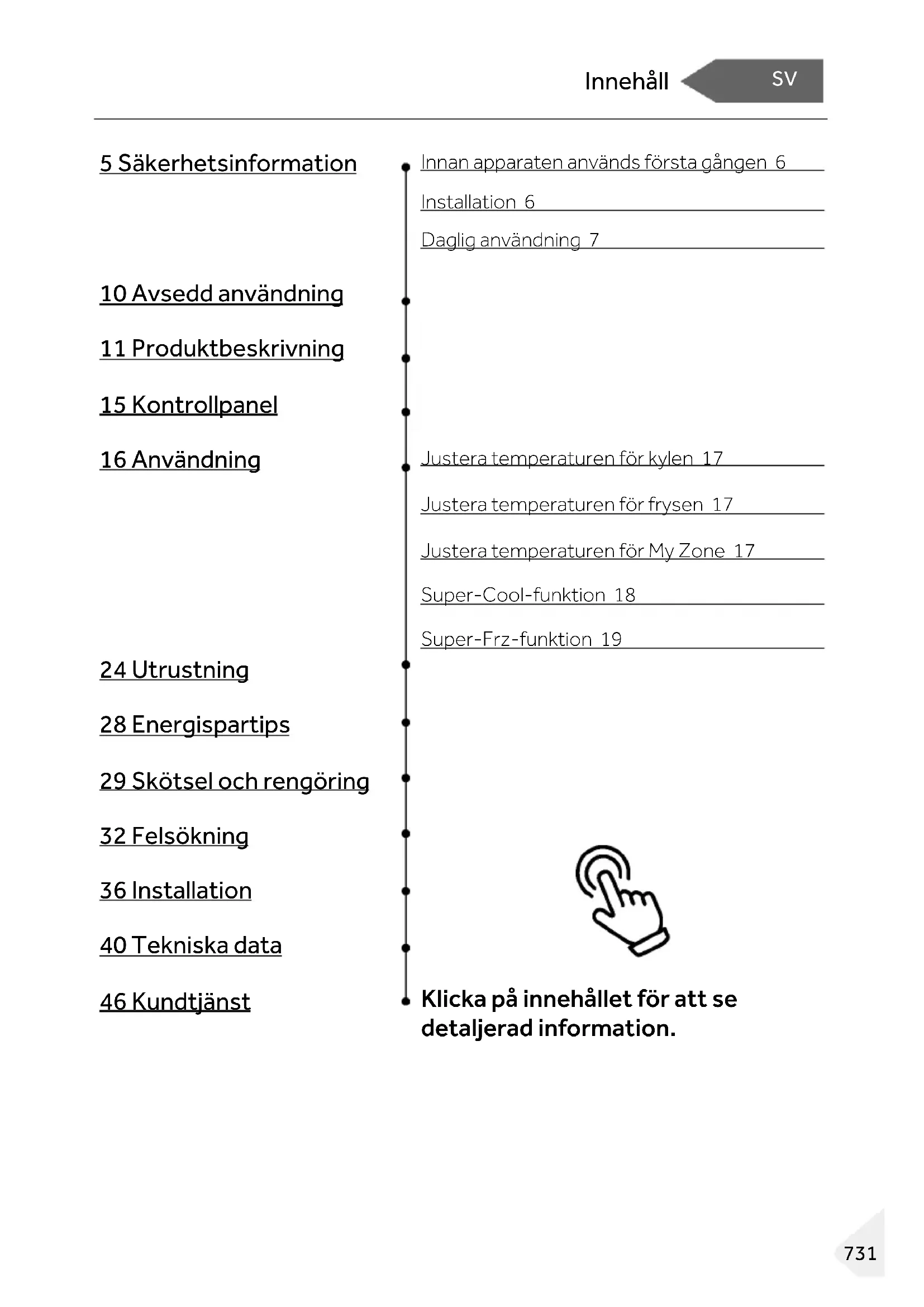 Innan apparaten används första gången 6 Installation 6 Daglig användning 7 10 Avsedd användning 11 Produktbeskrivning 15 Kontrollpanel 16 Användning Justera temperaturen för kylen 17 Justera temperaturen för frysen 17 Justera temperaturen för My Zone 17 Super-Cool-funktion 18 Super-Frz-funktion 19 24 Utrustning 28 Energispartips 29 Skötsel och rengöring 32 Felsökning 36 Installation 40 Tekniska data 46 Kundtjänst Klicka på innehållet för att se detaljerad information. 731Tack!