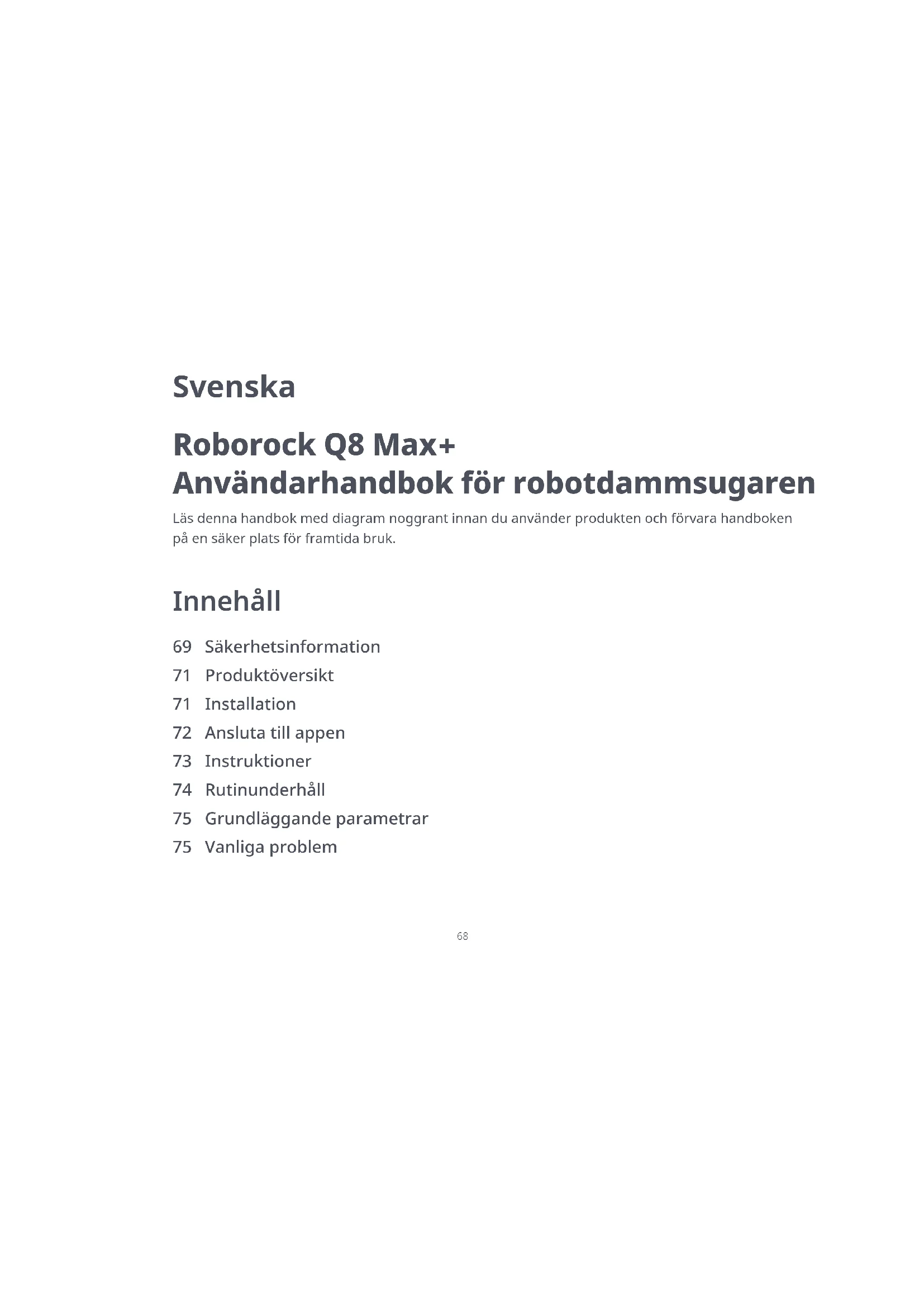 Användarhandbok för robotdammsugaren Svenska Innehåll 69 Säkerhetsinformation 71 Produktöversikt 71 Installation 72 Ansluta till appen 73 Instruktioner 74 Rutinunderhåll 75 Grundläggande parametrar 75 Vanliga problem69 Begränsningar