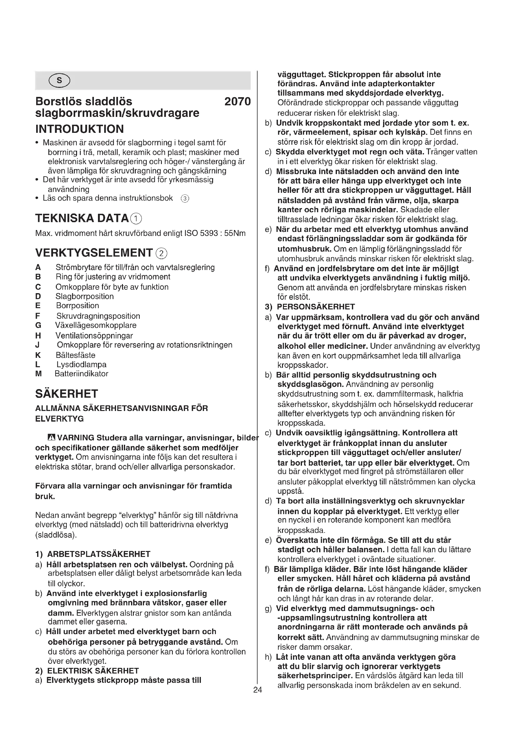 A Strömbrytare för till/från och varvtalsreglering B Ring för justering av vridmoment C Omkopplare för byte av funktion D Slagborrposition E Borrposition F Skruvdragningsposition G Växellägesomkopplare H Ventilationsöppningar J Omkopplare för reversering av rotationsriktningen K Bältesfäste L Lysdiodlampa M Batteriindikator SÄKERHET