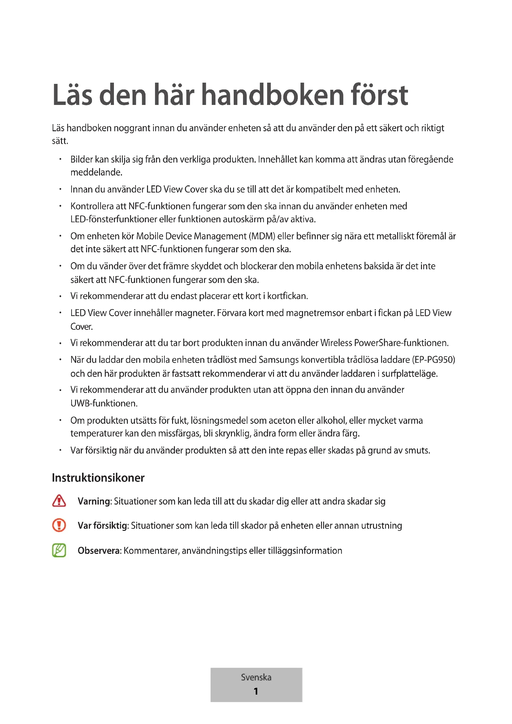 Var försiktig när du använder produkten så att den inte repas eller skadas på grund av smuts. Instruktionsikoner Varning: Situationer som kan leda till att du skadar dig eller att andra skadar sig Var försiktig: Situationer som kan leda till skador på enheten eller annan utrustning Observera: Kommentarer, användningstips eller tilläggsinformation Svenska