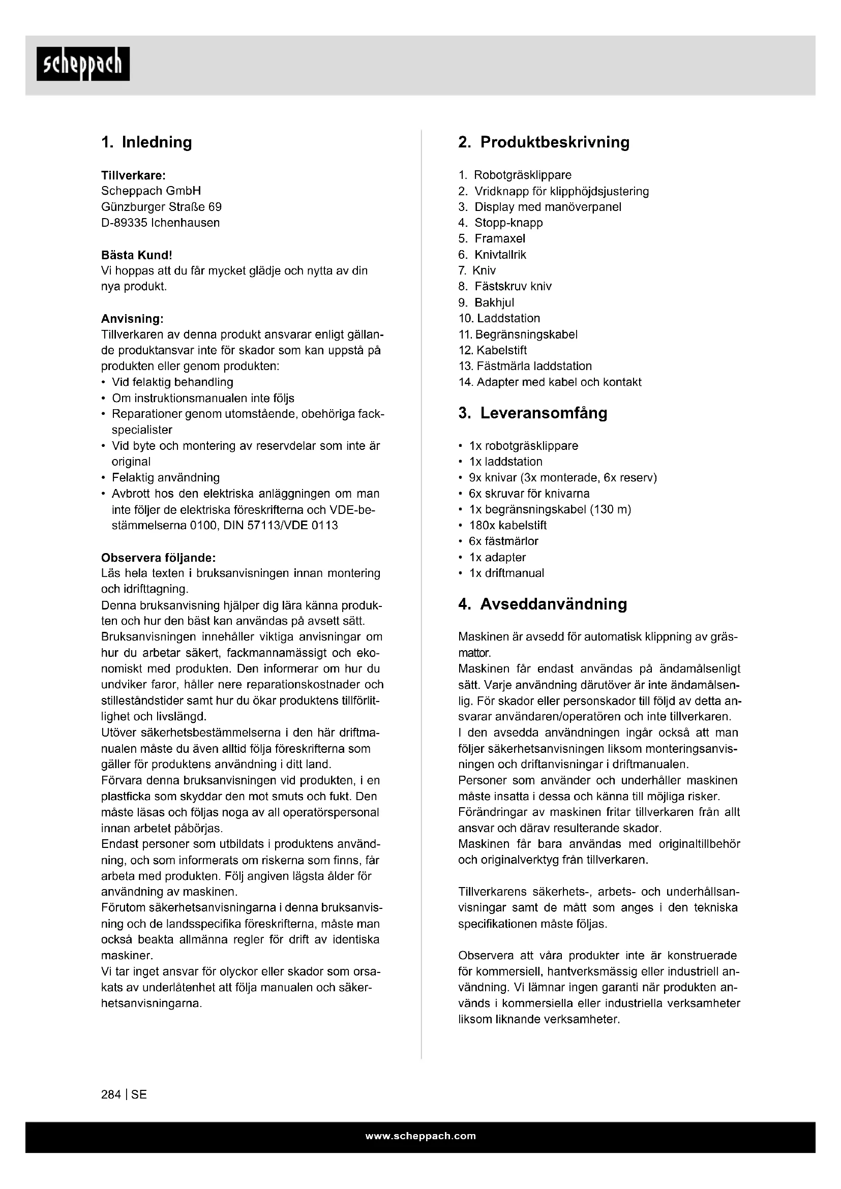 Förklaring av symbolerna på produkten Användningen av symboler i den här handboken ska göra dig uppmärksam på eventuella risker. Säkerhetssymbolerna och förklaringarna som anges i samband med dessa måste förstås. Varningarna i sig undanröjer inga risker och kan inte ersätta lämpliga åtgärder för att förebygga olyckor. Läs och följ instruktionsmanualen och säkerhetsanvisningarna före idrifttagning! Varning! Stäng av produkten innan du lyfter den eller arbetar på den. Fara genom delar som kan slungas iväg när den används. Håll ett säkert avstånd till produkten när den används. Håll händer och fötter borta från roterande knivar. Sitt eller stå inte på produkten. Skydda batteriet mot värme och eld. Skydda batteriet mot vatten och fukt. T 2 A Produktsäkerhet Skyddsklass II Batterier får inte slängas bland hushållsavfallet. ”POWER ON/OFF”-knapp (Till-/Från-knapp) Startknapp/valknapp (uppåt) Home-knapp (tillbaka till laddstationen)/ - valknapp (nedåt) OK-knapp PIN-kod inställning Datum/klockslag inställning WiFi (W-Lan) Bluetooth Produkten uppfyller kraven i gällande europeiska direktiv. Produkten uppfyller kraven i gällande serbiska direktiv.www.scheppach.com