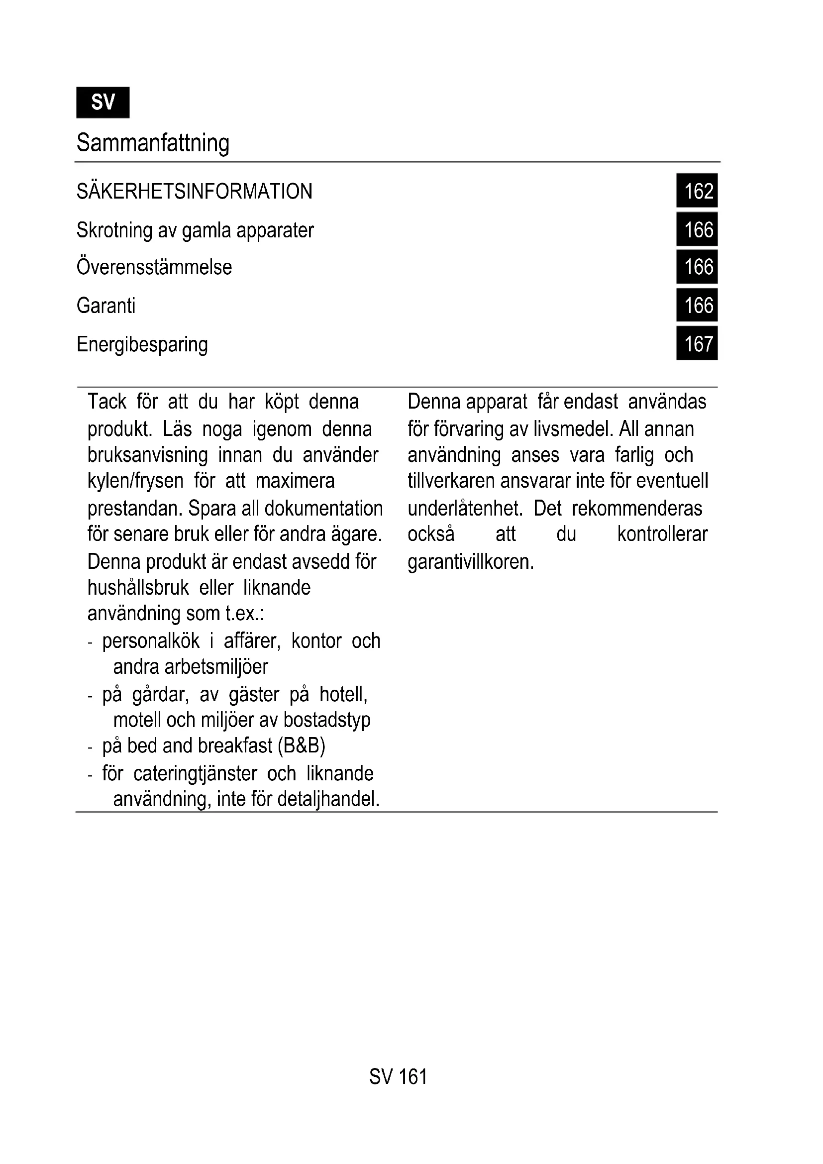Tack för att du har köpt denna produkt. Läs noga igenom denna bruksanvisning innan du använder kylen/frysen för att maximera prestandan. Spara all dokumentation för senare bruk eller för andra ägare. Denna produkt är endast avsedd för hushållsbruk eller liknande användning som t.ex.: - personalkök i affärer, kontor och andra arbetsmiljöer - på gårdar, av gäster på hotell, motell och miljöer av bostadstyp - på bed and breakfast (B&B) - för cateringtjänster och liknande användning, inte för detaljhandel. Denna apparat får endast användas för förvaring av livsmedel. All annan användning anses vara farlig och tillverkaren ansvarar inte för eventuell underlåtenhet. Det rekommenderas också att du kontrollerar garantivillkoren.SV 162 SÄKERHETSINFORMATION Läs bruks- och installationsanvisningarna noggrant! De innehåller viktig information om hur du ska installera, använda och underhålla apparaten. Tillverkaren ansvarar inte för följder på grund av att instruktioner och varningar inte följs. Spara alla dokument för framtida behov, eller för nästa ägare.
