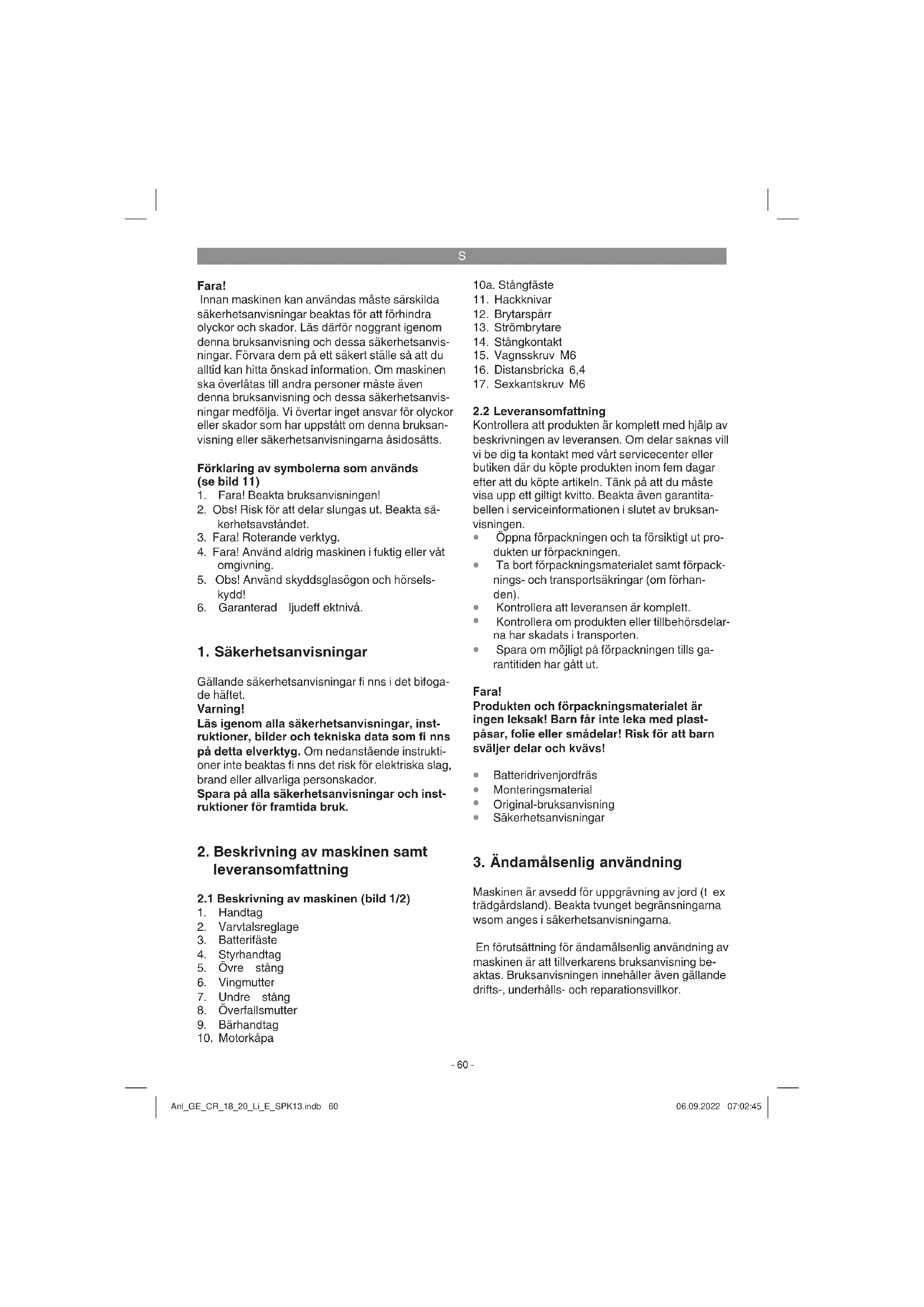 Maskinen är avsedd för uppgrävning av jord (t ex trädgårdsland). Beakta tvunget begränsningarna wsom anges i säkerhetsanvisningarna. En förutsättning för ändamålsenlig användning av maskinen är att tillverkarens bruksanvisning be- aktas. Bruksanvisningen innehåller även gällande drifts-, underhålls- och reparationsvillkor. Anl_GE_CR_18_20_Li_E_SPK13.indb 60Anl_GE_CR_18_20_Li_E_SPK13.indb 60 06.09.2022 07:02:4506.09.2022 07:02:45S