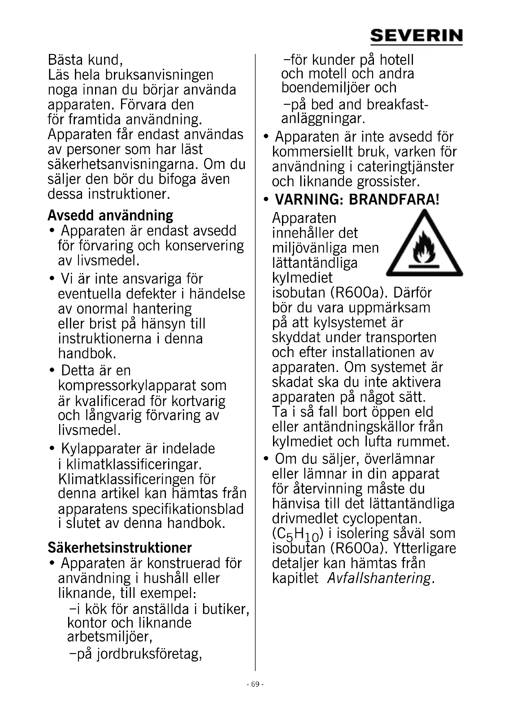 - VARNING: BRANDFARA! Apparaten innehåller det miljövänliga men lättantändliga kylmediet isobutan (R600a). Därför bör du vara uppmärksam på att kylsystemet är skyddat under transporten och efter installationen av apparaten. Om systemet är skadat ska du inte aktivera apparaten på något sätt. Ta i så fall bort öppen eld eller antändningskällor från kylmediet och lufta rummet.