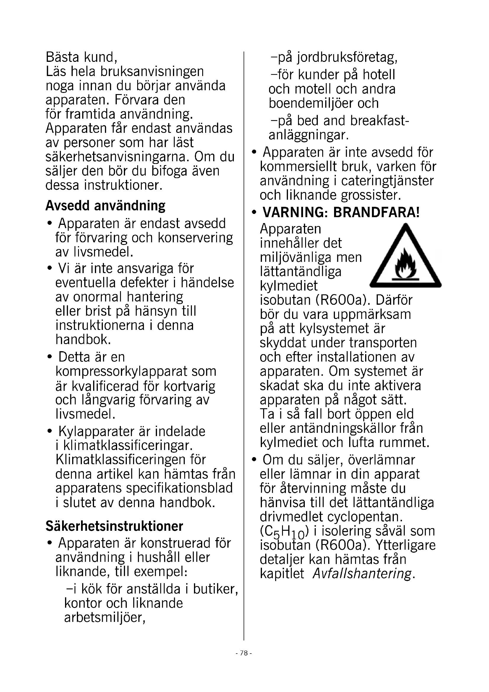 - VARNING: BRANDFARA! Apparaten innehåller det miljövänliga men lättantändliga kylmediet isobutan (R600a). Därför bör du vara uppmärksam på att kylsystemet är skyddat under transporten och efter installationen av apparaten. Om systemet är skadat ska du inte aktivera apparaten på något sätt. Ta i så fall bort öppen eld eller antändningskällor från kylmediet och lufta rummet.