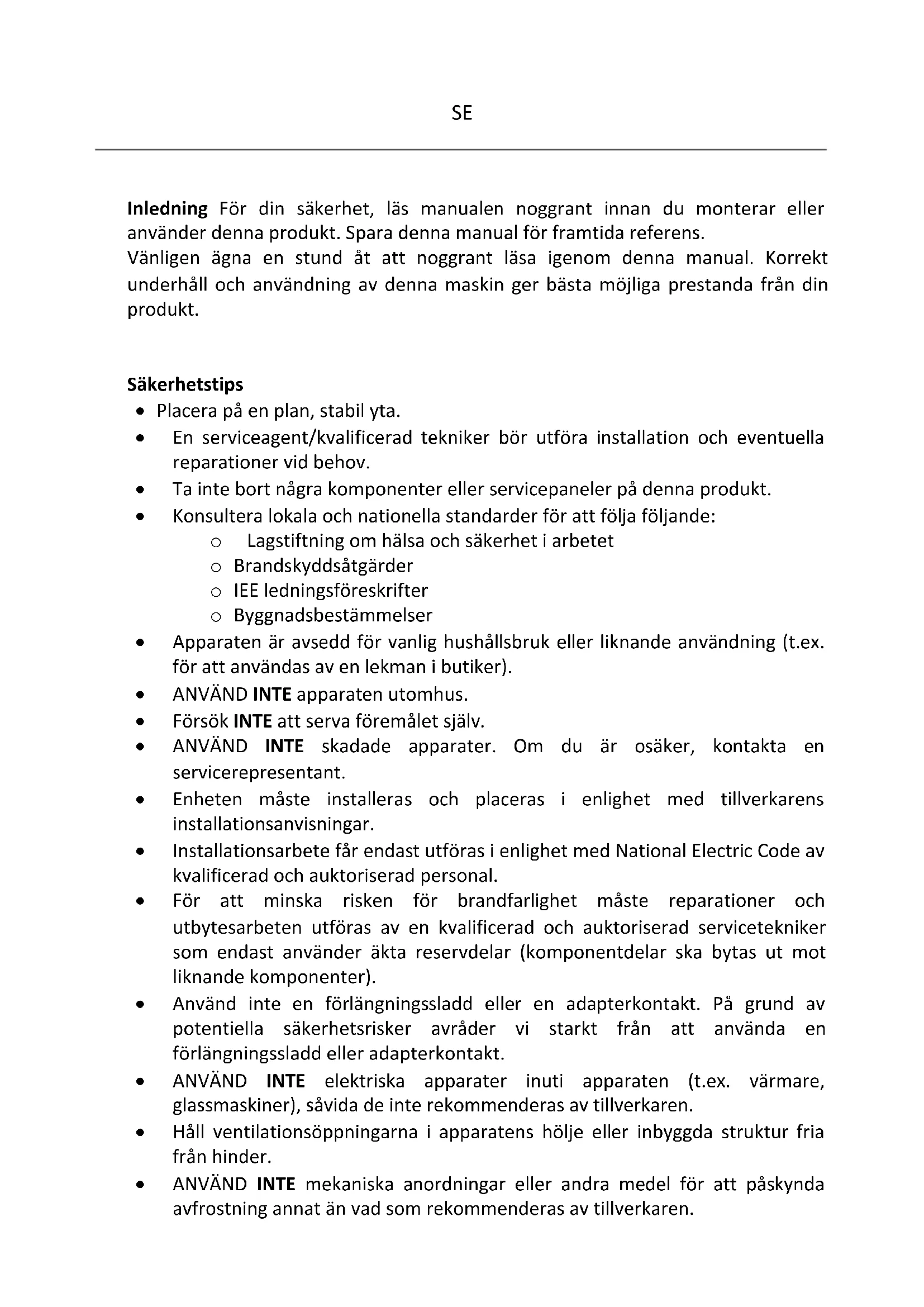 - ANVÄND INTE mekaniska anordningar eller andra medel för att påskynda avfrostning annat än vad som rekommenderas av tillverkaren.SE