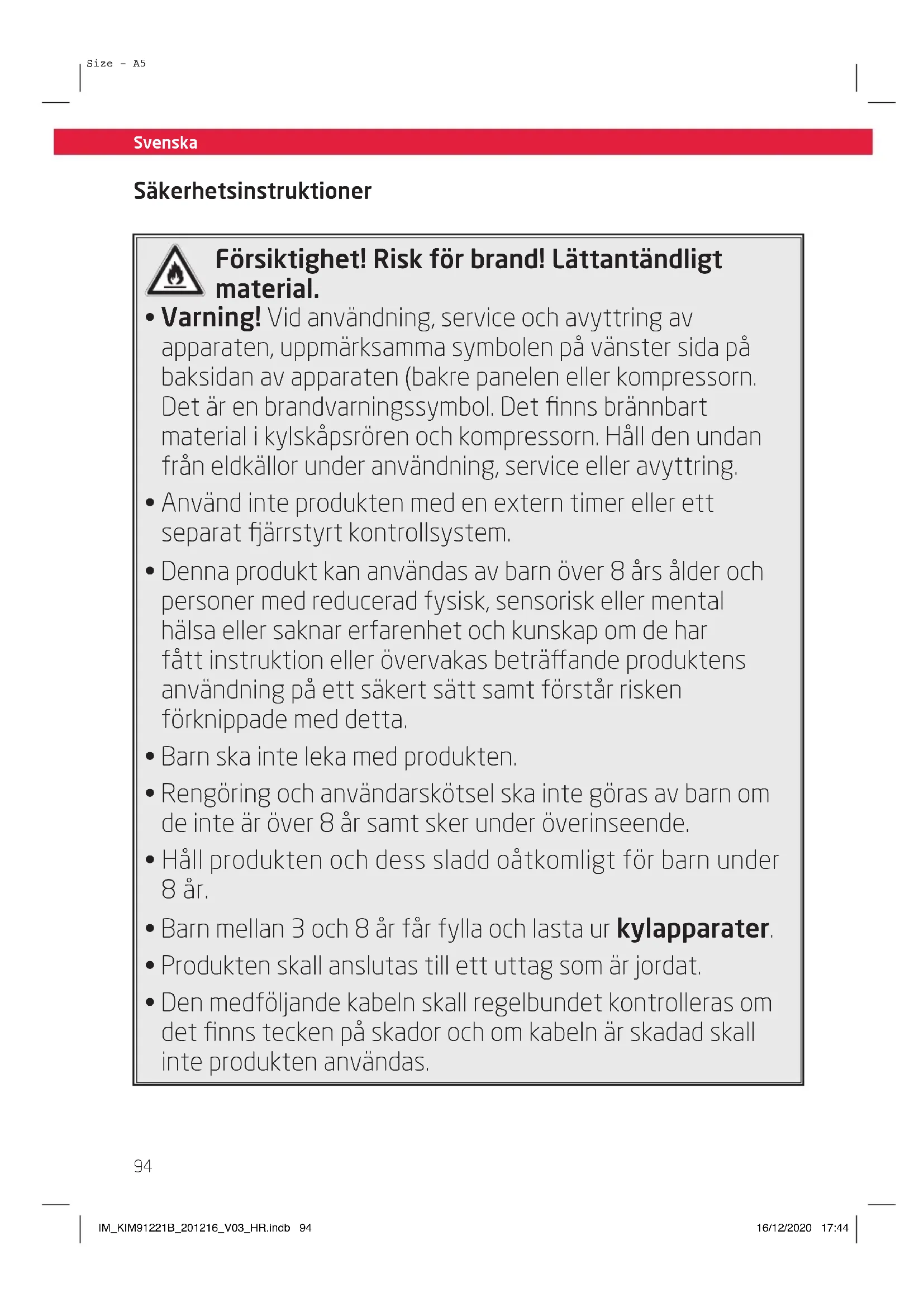 - Den medföljande kabeln skall regelbundet kontrolleras om det finns tecken på skador och om kabeln är skadad skall inte produkten användas. IM_KIM91221B_201216_V03_HR.indb 94IM_KIM91221B_201216_V03_HR.indb 94 16/12/2020 17:4416/12/2020 17:44Svenska