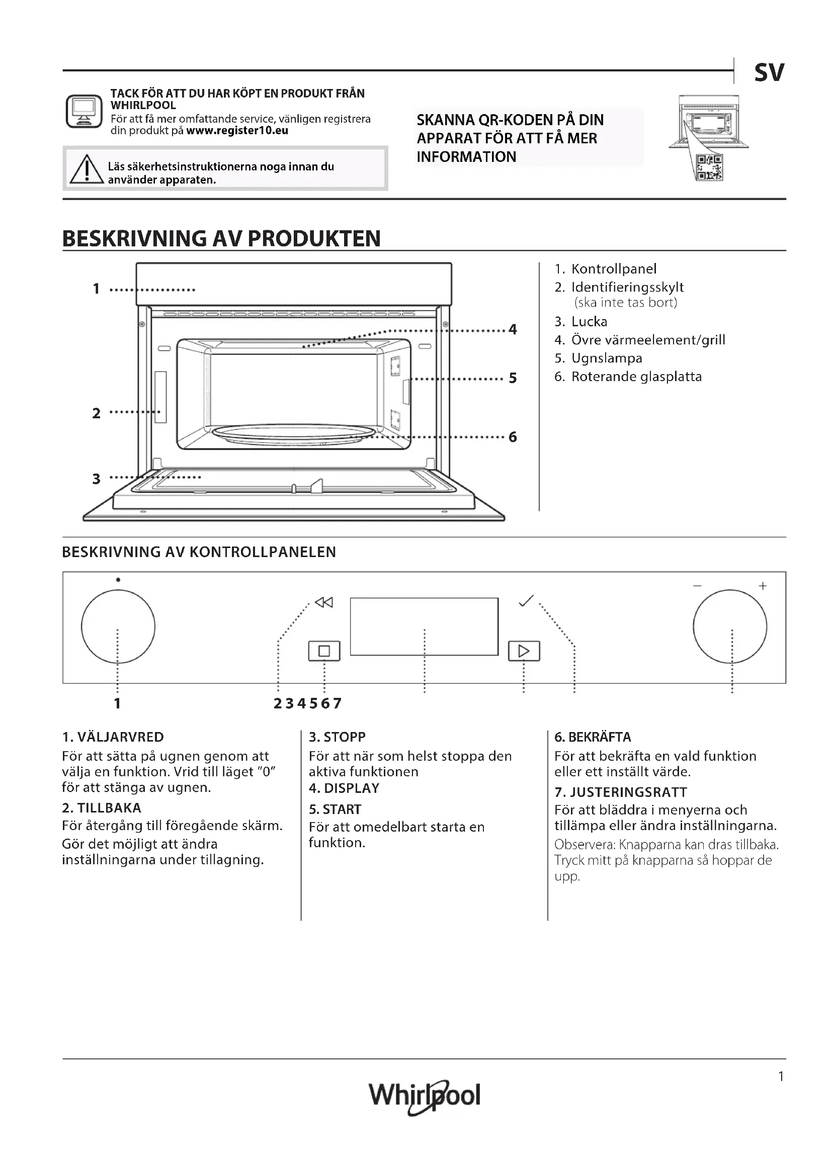 TACK FÖR ATT DU HAR KÖPT EN PRODUKT FRÅN WHIRLPOOL För att få mer omfattande service, vänligen registrera din produkt på www.register10.eu Läs säkerhetsinstruktionerna noga innan du använder apparaten.
