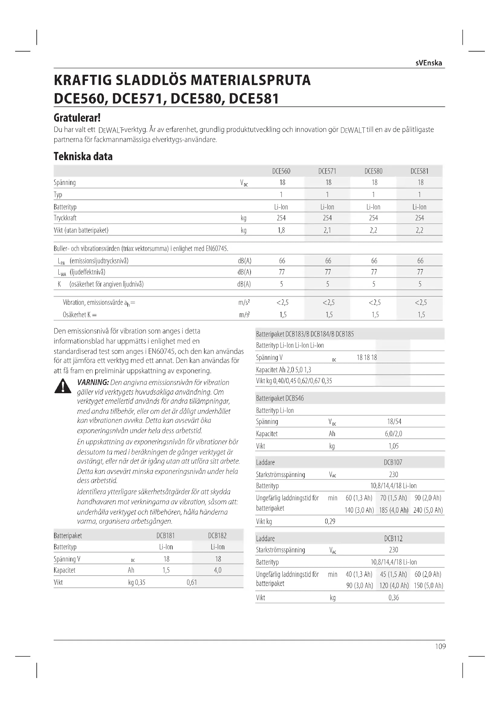 fulladdata batteripaket på en kall och torr plats utan laddare för optimaltresultat. NOTERA: Batteripaket bör inte förvaras helt urladdade. Batteripaketet behöver laddas innan det användsigen. Etiketter på laddare och batteripaket Förutom bilddiagrammen som används i denna manual kan etiketterna på laddaren och batteripaketet visa följande bilddiagram: Läs instruktionshandbok föreanvändning. Se Tekniska data angåendeladdningstid. exempel på etikettmärkning för användning och transport Stick inte in ledandeföremål. Ladda inte skadadebatteripaket. Utsätt inte för vatten. Se till att undermåliga sladdar omedelbart bytsut. Ladda endast mellan 4 ˚C och 40 ˚C. Endast för användninginomhus. Kassera batteripaketet med vederbörlig hänsyn tillmiljön. Ladda endast DeWALT batteripaket med avsedda DeWALT laddare. Laddning av batteripaket med andra än de avsedda DeWALT batterierna med en DeWALT laddare kan göra att de brister eller så kan det leda till farligasituationer. Bränn intebatteripaketet. Användning: Använd utan transportlock, indikerar Wh-märkningen 108 Wh (ett batteri med 108 Wh). Transport: Transport med inbyggt transportlock, Wh-märkning indikerar 3 x 36 Wh (tre batterier på 36 Wh). Batterityp DCE560, DCE571, DCE580 och DCE581 arbetar med ett 18 volt batteripaket. Dessa batteripaket kan användas: DCB181, DCB182, DCB183, DCB183B, DCB184, DCB184B, DCB185, DCB546. Se Tekniska Data för merinformation. Förpackningsinnehåll Förpackningen innehåller: 1 Patronhållare (DCE560 och DCE581) 1 Tubhållare (DCE571, DCE580 och DCE581) 1 Fogpistol 1 Kort plungerstång (DCE581) 1 Li-jon batteripaket 1 Instruktionshandbok