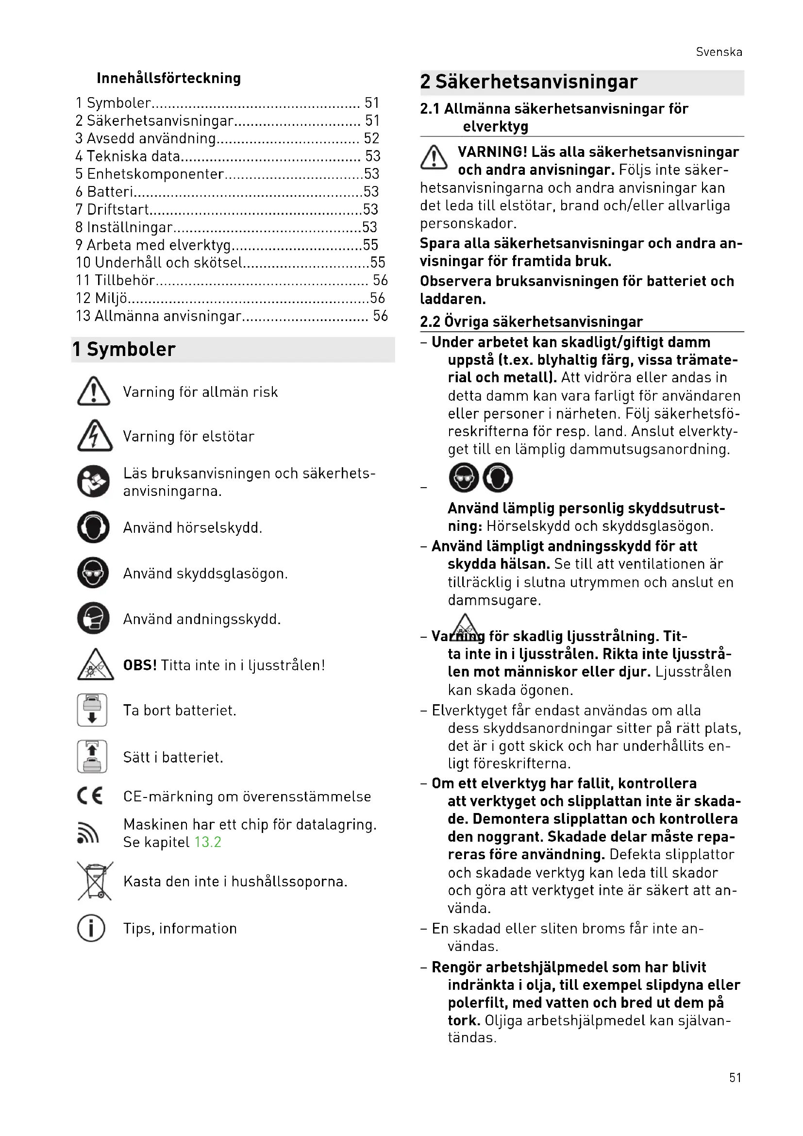 - 13 Allmänna anvisningar 1 Symboler Varning för allmän risk Varning för elstötar Läs bruksanvisningen och säkerhets anvisningarna. Använd hörselskydd. Använd skyddsglasögon. Använd andningsskydd. OBS! Titta inte in i ljusstrålen! Ta bort batteriet. Sätt i batteriet. CE-märkning om överensstämmelse Maskinen har ett chip för datalagring. Se kapitel13.2 Kasta den inte i hushållssoporna. Tips, information 2 Säkerhetsanvisningar p. 56