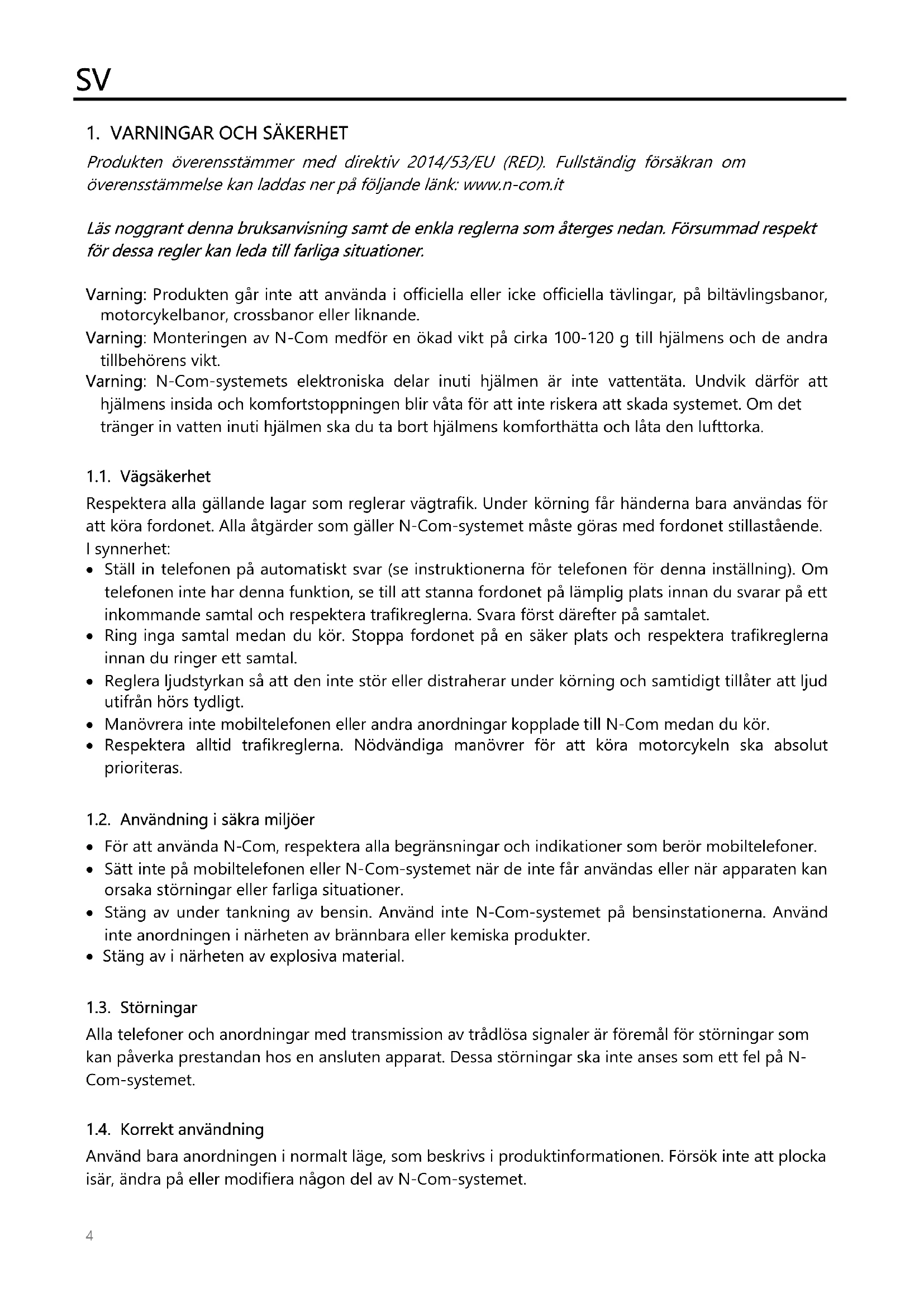 Varning: Produkten går inte att använda i officiella eller icke officiella tävlingar, på biltävlingsbanor, motorcykelbanor, crossbanor eller liknande. Varning: Monteringen av N-Com medför en ökad vikt på cirka 100-120 g till hjälmens och de andra tillbehörens vikt. Varning: N-Com-systemets elektroniska delar inuti hjälmen är inte vattentäta. Undvik därför att hjälmens insida och komfortstoppningen blir våta för att inte riskera att skada systemet. Om det tränger in vatten inuti hjälmen ska du ta bort hjälmens komforthätta och låta den lufttorka. 1.1. Vägsäkerhet Respektera alla gällande lagar som reglerar vägtrafik. Under körning får händerna bara användas för att köra fordonet. Alla åtgärder som gäller N-Com-systemet måste göras med fordonet stillastående. I synnerhet: