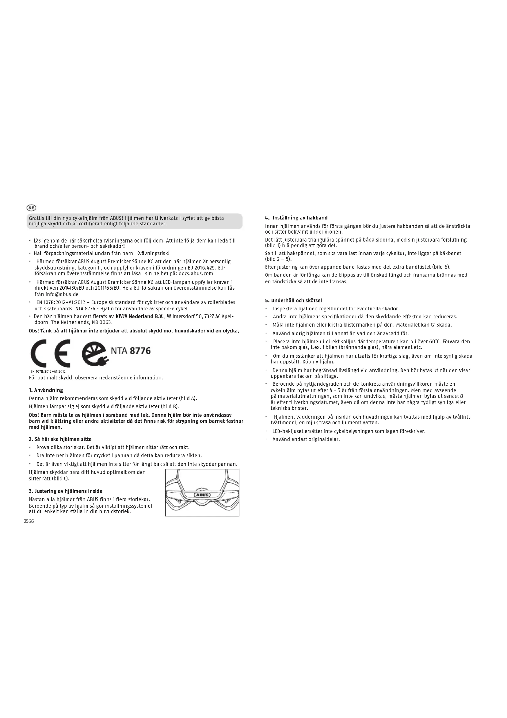 - Härmed försäkrar ABUS August Bremicker Söhne KG att den här hjälmen är personlig skyddsutrustning, kategori II, och uppfyller kraven i förordningen EU 2016/425. EU- försäkran om överensstämmelse finns att läsa i sin helhet på: docs.abus.com