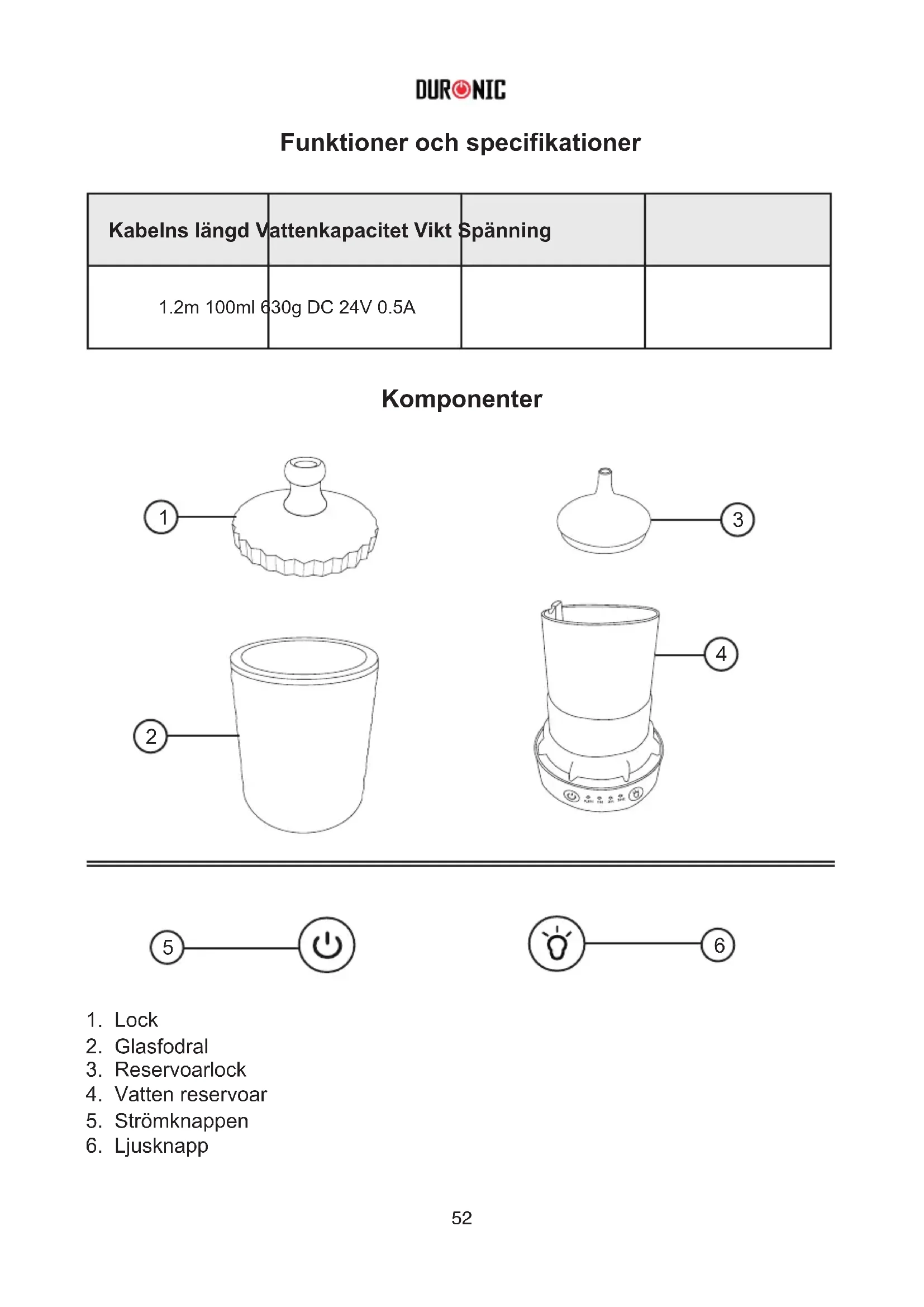- Ljuset kan tändas även utan vatten och fungerar då som nattlampa. Funktion för ström- och ljusknapp Strömbrytare: