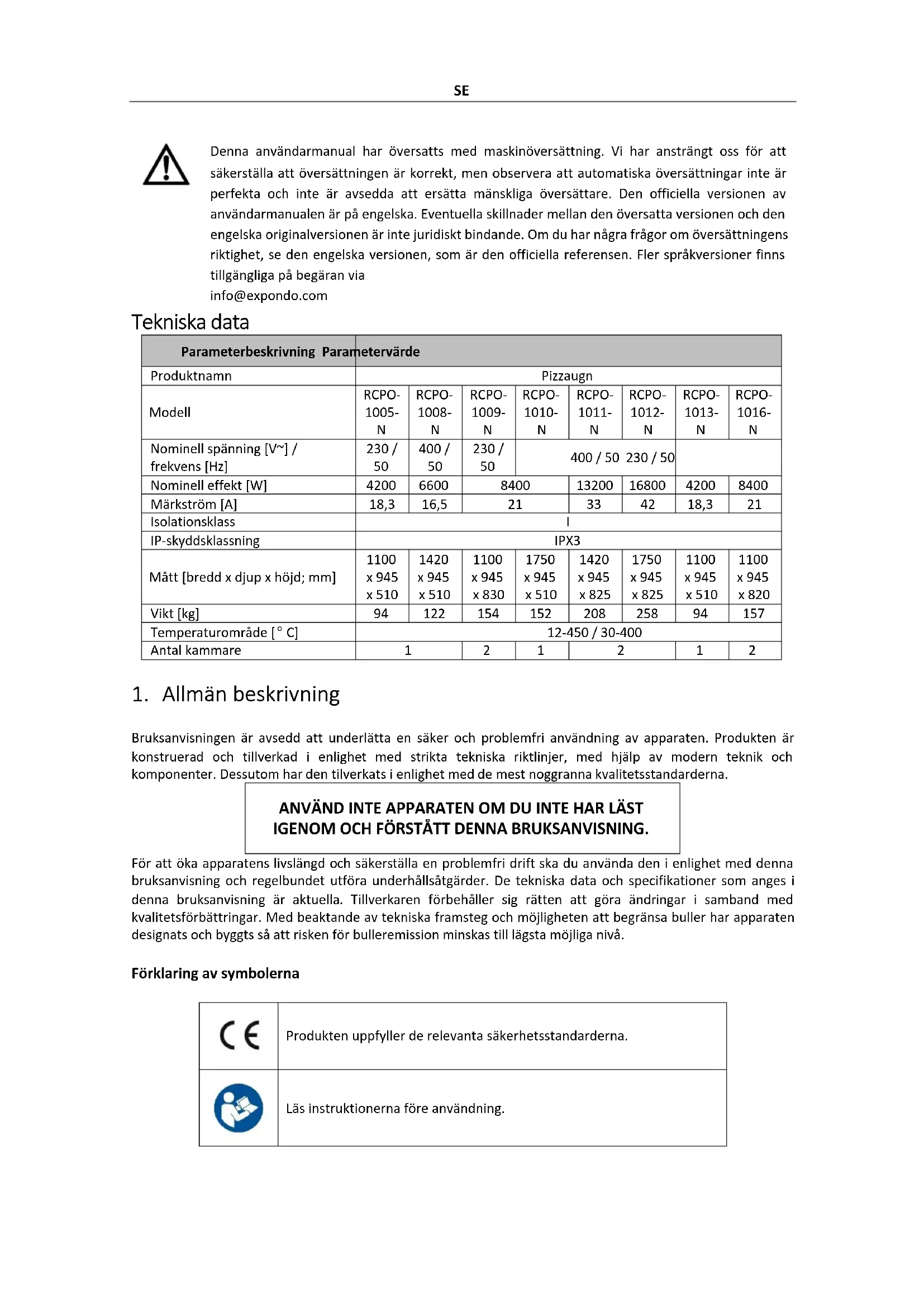 Termerna "enhet" aller "produkt" används i varningarna och instruktionerna für att referera till: PIZZAUGN.