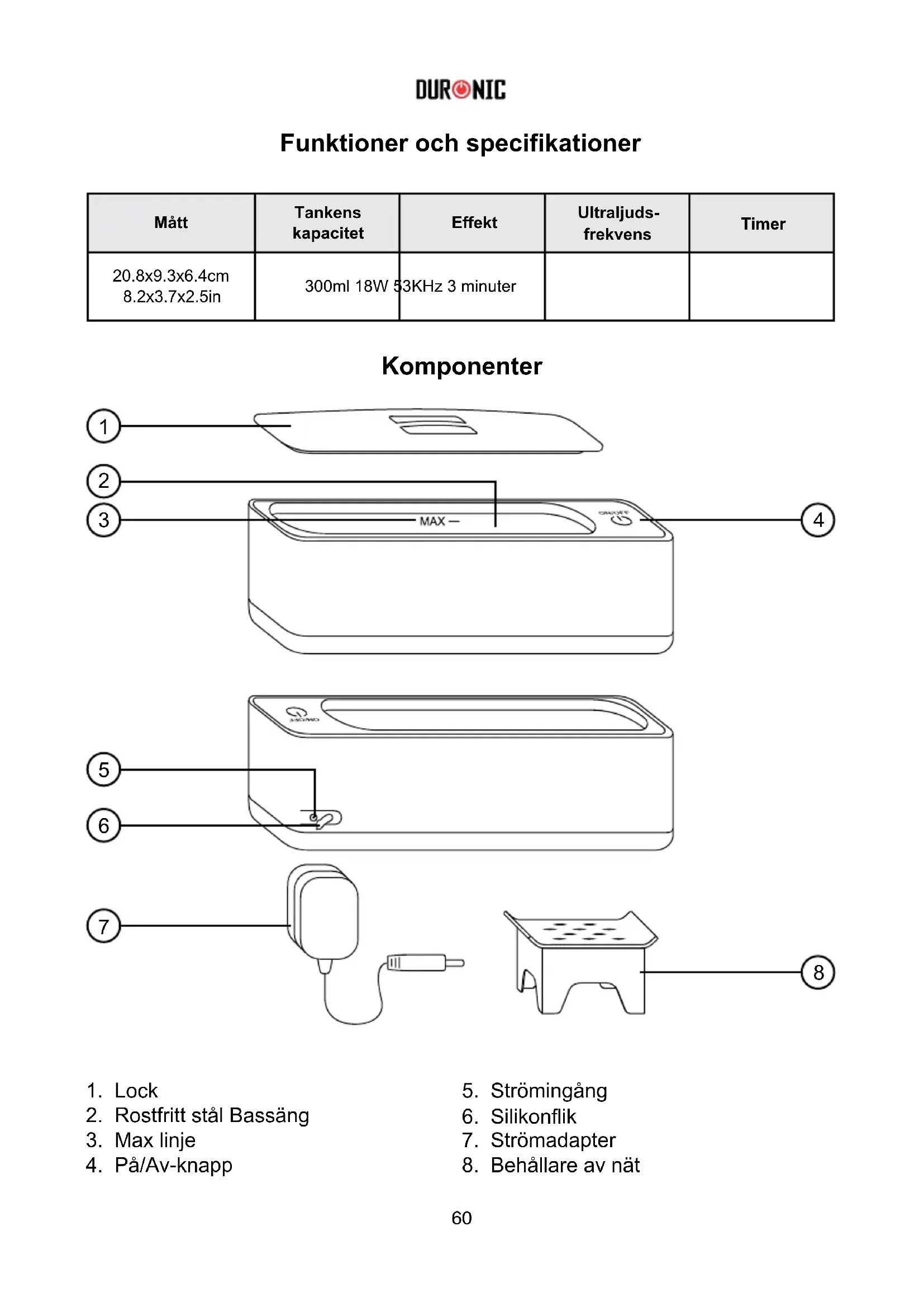 - Förvara på en torr plats. VARNING: Sänk INTE ner elektriska föremål som klockor i ultraljudsrengöraren om inte tillverkaren anser att de är vattentäta. Rengör på egen risk. Försök INTE att rengöra magneter eller föremål med magneter i, eftersom de kan skada apparaten. Placera aldrig batterier eller kemikalier inuti apparaten. Rengör INTE ömtåliga eller lätt skadade föremål i ultraljudsrengöraren, inklusive pärlor och jade. Kontrollera alltid om föremålet som du vill rengöra är lämpligt.65 Felsökning Problem Trolig orsak Lösning Maskinen går inte att slå på. Är strömförsörjningen korrekt ansluten till vägguttaget? Sätt i nätkontakten korrekt i uttaget. Är nätsladden skadad? Avbryt försöken att använda maskinen. Kontakta Duronic. Föremålen blev inte ordentligt rena efter tvätt. Otillräckligt med vatten i stålbehållaren. Tillsätt tillräckligt med vatten för att helt sänka ned rengöringsföremålen eller fyll upp till vattennivån "MAX". Föremålet kan behöva lite rengöringsmedel. Tillsätt en liten mängd rengöringslösning. Smutsen på föremålets yta är väldigt klibbig. Kan rengöras era gånger (det bästa intervallet mellan två rengöringar är 5 minuter). Föremålet har mycket olja på ytan. Kranvattnets avfettande effekt är inte tillräckligt stark för att rengöra, så tillsätt lite rengöringsmedel för att underlätta rengöringen. Oxiderade och svärtade ytor på guld- och silversmycken har inte rengjorts. Tillsätt en liten mängd professionell rengöringslösning för guld- och silversmycken för att ta bort det oxiderade ytskiktet. Sök professionell hjälp om du är osäker. Ytan på föremålet är skadad efter rengöring. Maskinens standardrengöringseffekt är för stark. Föremål med elektroplätering och sprutbehandling på ytan bör ha en kortare rengöringstid. Lägg ömtåliga föremål i en skyddande behållare eller påse före rengöring. Rengöring av ömtåliga föremål sker på egen risk. Om du är osäker ska du lämna in föremålen för professionell rengöring. Försök inte att rengöra i ultraljudsrengöraren eftersom det kan skada föremålet. För alla andra problem eller frågor, vänligen kontakta Duronic.66 Elektrikli ve Elektronik Ekipman Tüketicileri için Atık Bertarafına İlişkin Bilgiler. Bir ürün ve/veya beraberindeki belgeler üzerindeki bu işaret, ürünün bertaraf edilecekse, Atık Elektrikli ve Elektronik Ekipman (WEEE) olarak değerlendirilmelidir. WEEE işaretli ürünler genel evsel atıklarla karıştırılmamalı, kullanılan malzemelerin işlenmesi, geri kazanımı ve geri dönüşümü için ayrı tutulmalıdır. Uygun işlem, geri kazanım ve geri dönüşüm için; lütfen tüm WEEE işaretli atıkları, ücretsiz olarak kabul edilecekleri Yerel Yetkili Sivil atık sahanıza götürün. Müşteriler Atık Elektrikli ve Elektronik Ekipmanı doğru bir şekilde bertaraf ederlerse, değerli kaynakların korunmasına yardımcı olacak ve atığın içerebileceği tehlikeli maddelerin insan sağlığı ve çevre üzerindeki olası olumsuz etkilerini önleyeceklerdir. Informatie over afvalverwerking voor Afgedankte Elektrische en Elektronische Apparatuur (AEEA). Dit teken geeft aan dat een product en/of bijbehorende documentatie bij verwijdering, dient te worden behandeld als Afgedankte Elektrische en Elektronische Apparatuur (AEEA). Alle AEEA gemarkeerde producten dienen niet te worden gemengd met algemeen huishoudelijk afval, maar moeten apart worden gehouden voor de behandeling, herwinning en hergebruik van de gebruikte materialen. Voor de juiste verwerking, terugwinning en recycling; breng al het AEEA- afval naar de gemeentewerf, waar het gratis wordt geaccepteerd. Als klanten afgedankte elektrische en elektronische apparatuur op de juiste manier weggooien, helpen ze waardevolle hulpbronnen te besparen en voorkomen ze potentiële negatieve gevolgen voor de volksgezondheid en het milieu van gevaarlijke materialen die het afval kan bevatten. Information om avfallshantering för konsumenter av elektrisk och elektronisk utrustning. Detta märke på en produkt och/eller medföljande dokument anger att när den ska kasseras, måste den behandlas som avfall Elektrisk och elektronisk utrustning (WEEE). WEEE-märkta produkter får inte blandas med vanligt hushållsavfall, utan ska hållas åtskilda för behandling, återvinning och återanvändning av de material som använts. För korrekt behandling, återvinning och återanvändning, vänligen ta allt WEEE-märkt avfall till din lokala myndighets kommunala avfallsstation, där det tas emot kostnadsfritt. Om kunderna kasserar avfall från elektrisk och elektronisk utrustning på rätt sätt hjälpa till att spara värdefulla resurser och förhindra eventuella negativa effekter på människors hälsa och miljön, av eventuella farliga material som avfallet kan innehålla. Information for consumers on the disposal of Waste Electrical & Electronic Equipment (WEEE). This mark on a product and/or accompanying documents indicates that when it is to be disposed of, it must be treated as Waste Electrical & Electronic Equipment, (WEEE). Any WEEE marked products must not be mixed with general household waste, but kept separate for the treatment, recovery and recycling of the materials used. For proper treatment, recovery and recycling; please take all WEEE marked waste to your Local Authority Civic waste site, where it will be accepted free of charge. If customers dispose of Waste Electrical & Electronic Equipment correctly, they will be helping to save valuable resources and preventing any potential negative effects upon human health and the environment, of any hazardous materials that the waste may contain. Information sur l’élimination des déchets d’équipements électriques et électroniques (WEEE). Ce symbole apparaît sur le produit et/ou les documents accompagnant ce produit pour indiquer que pour procéder à l
