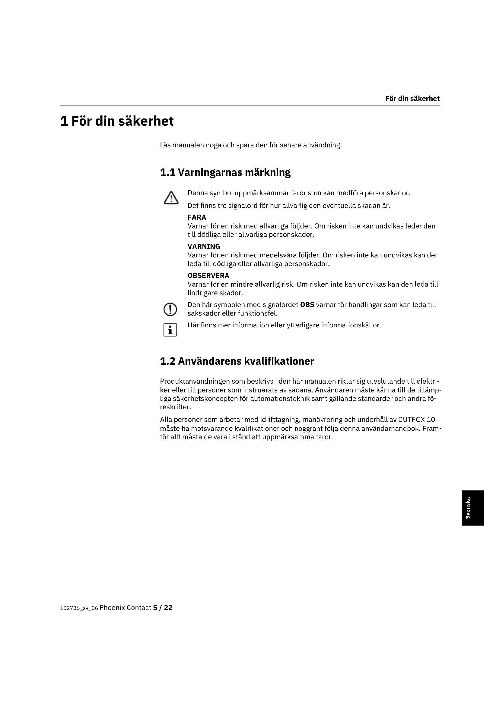 Produktanvändningen som beskrivs i den här manualen riktar sig uteslutande till elektri- ker eller till personer som instruerats av sådana. Användaren måste känna till de tillämp- liga säkerhetskoncepten för automationsteknik samt gällande standarder och andra fö- reskrifter. Alla personer som arbetar med idrifttagning, manövrering och underhåll av CUTFOX 10 måste ha motsvarande kvalifikationer och noggrant följa denna användarhandbok. Fram- för allt måste de vara i stånd att uppmärksamma faror. Denna symbol uppmärksammar faror som kan medföra personskador. Det finns tre signalord för hur allvarlig den eventuella skadan är. FARA Varnar för en risk med allvarliga följder. Om risken inte kan undvikas leder den till dödliga eller allvarliga personskador. VARNING Varnar för en risk med medelsvåra följder. Om risken inte kan undvikas kan den leda till dödliga eller allvarliga personskador. OBSERVERA Varnar för en mindre allvarlig risk. Om risken inte kan undvikas kan den leda till lindrigare skador. Den här symbolen med signalordet OBS varnar för handlingar som kan leda till sakskador eller funktionsfel. Här finns mer information eller ytterligare informationskällor.CUTFOX 10 6 / 22 Phoenix Contact 102786_sv_06