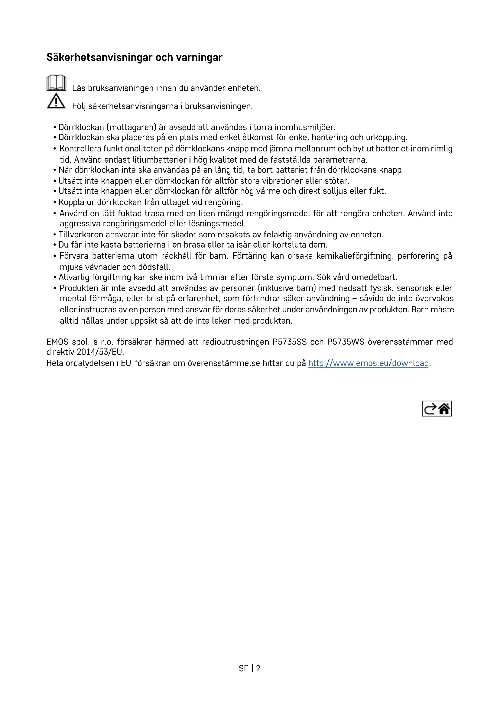 - Produkten är inte avsedd att användas av personer (inklusive barn) med nedsatt fysisk, sensorisk eller mental förmåga, eller brist på erfarenhet, som förhindrar säker användning – såvida de inte övervakas eller instrueras av en person med ansvar för deras säkerhet under användningen av produkten. Barn måste alltid hållas under uppsikt så att de inte leker med produkten. EMOS spol. s r.o. försäkrar härmed att radioutrustningen P5735SS och P5735WS överensstämmer med direktiv 2014/53/EU. Hela ordalydelsen i EU-försäkran om överensstämmelse hittar du på http://www.emos.eu/download.SE | 3 80 mm 38 mm 19 mm 65 mm 80 mm 92 mm Tekniska specikationer Överföringsräckvidd: upp till 150m på öppen yta (kan minska till en femtedel i ett livligt område) Knapp: vattenbeständig; kapslingsklass IP44 Parkoppla dörrklockan med knappar: självinlär- ningsfunktion Parkopplingskapacitet: max. 8 knappar per dörr- klocka, max. 2 knappar per dörrklocka i EMOS GoSmart-appen Antal ringsignaler: 52 Överföringsfrekvens: 433,92MHz, 10mW ERP max. Strömförsörjning dörrklocka: 230V AC/50Hz Strömförsörjning knapp: 1st. 3V-batteri (typ CR2032, medföljer) Medföljer: dubbelhäftande tejpSE | 4