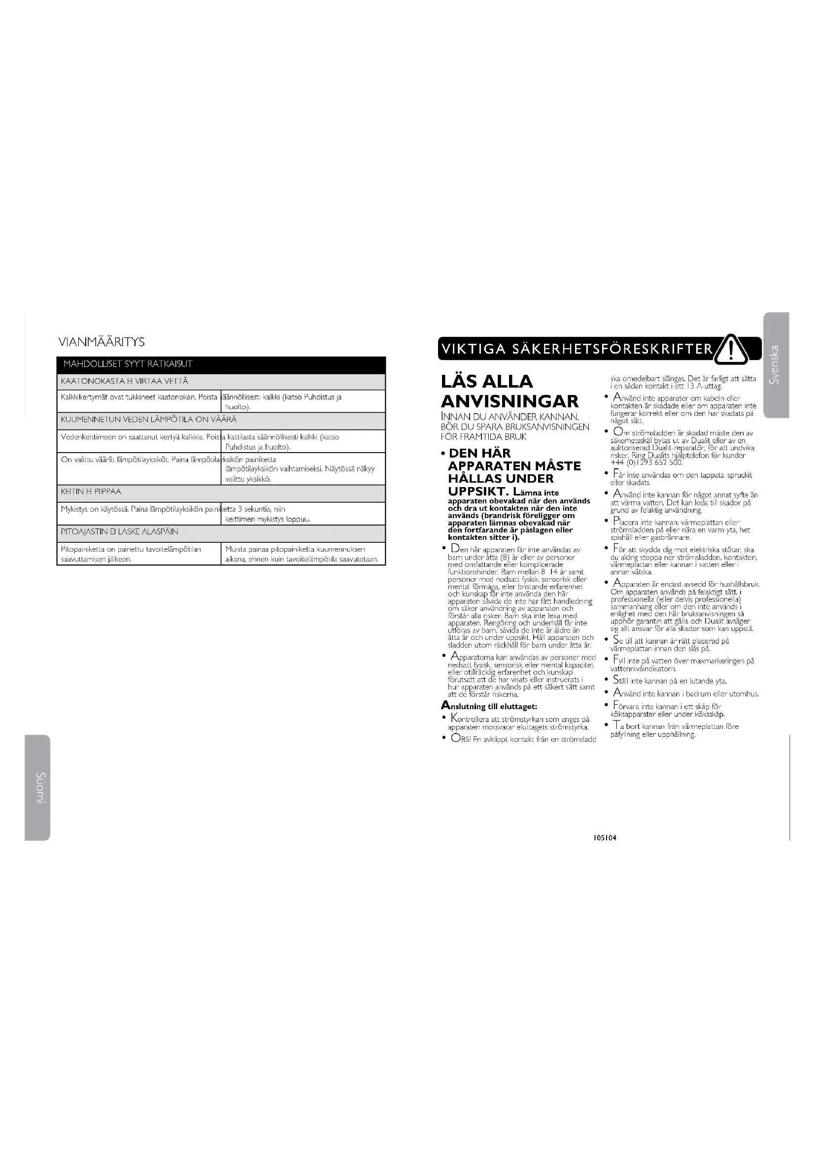 - Om strömsladden är skadad måste den av säkerhetsskäl bytas ut av Dualit eller av en auktoriserad Dualit-reparatör, för att undvika risker. Ring Dualits hjälptelefon för kunder +44 (0)1293 652 500.