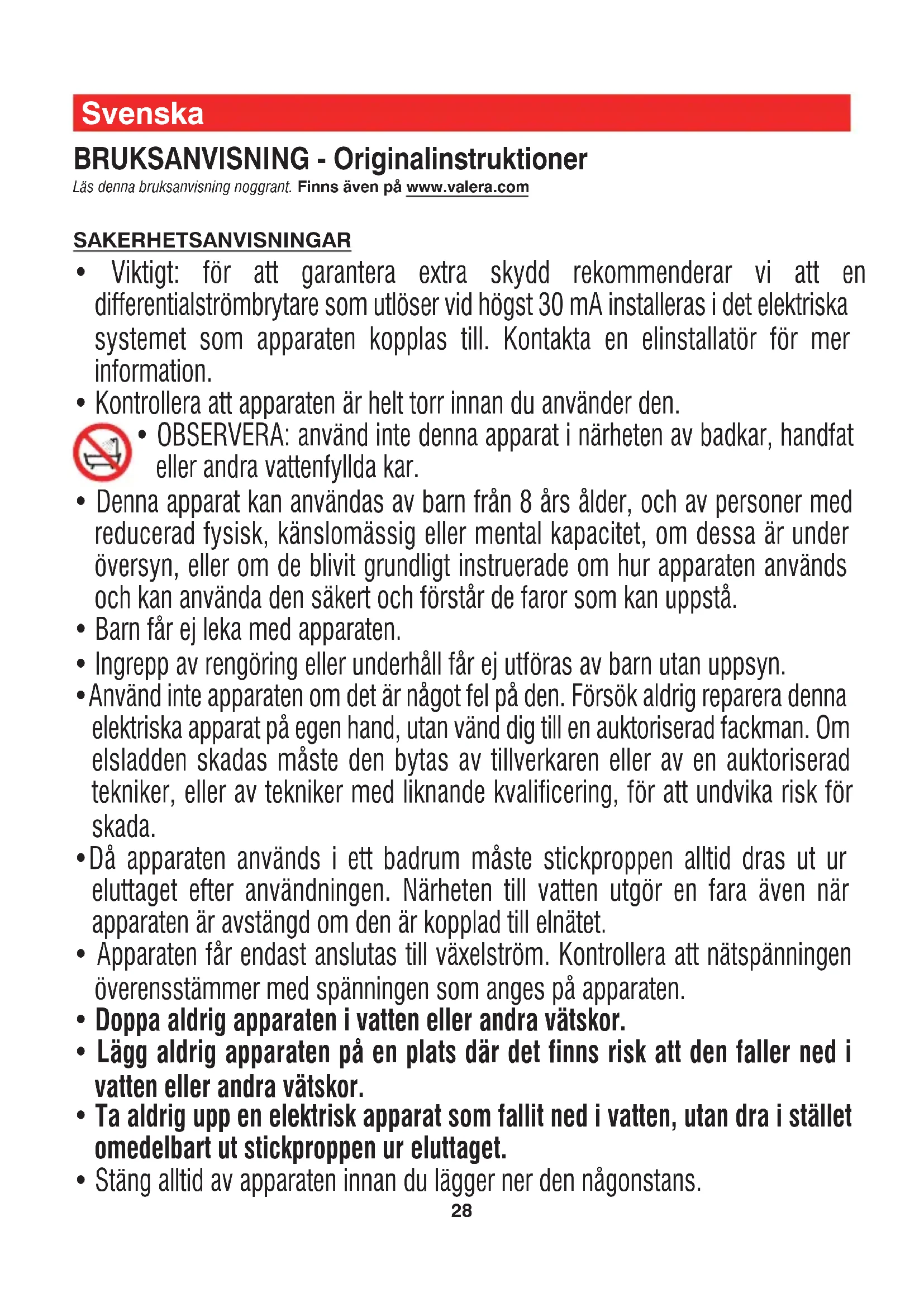 om reparationer görs av icke auktoriserade personer. Om fel uppstår ska apparaten återsändas väl emballerad tillsammans med ett daterat garantibevis som ska vara stämplat av återförsäljaren. Apparaten ska sändas till något av våra auktoriserade Servicecenter eller till återförsäljaren, som i sin tur sedan sörjer för att apparaten skickas vidare till den officiella importören för garantireparation.31 Suomi KAYTTOOHJEET - Alkuperäiset ohjeet Lue huolellisesti nämä käyttöohjeet. Saatavana myös osoitteesta www.valera.com TURVALLISUUSOHJEET