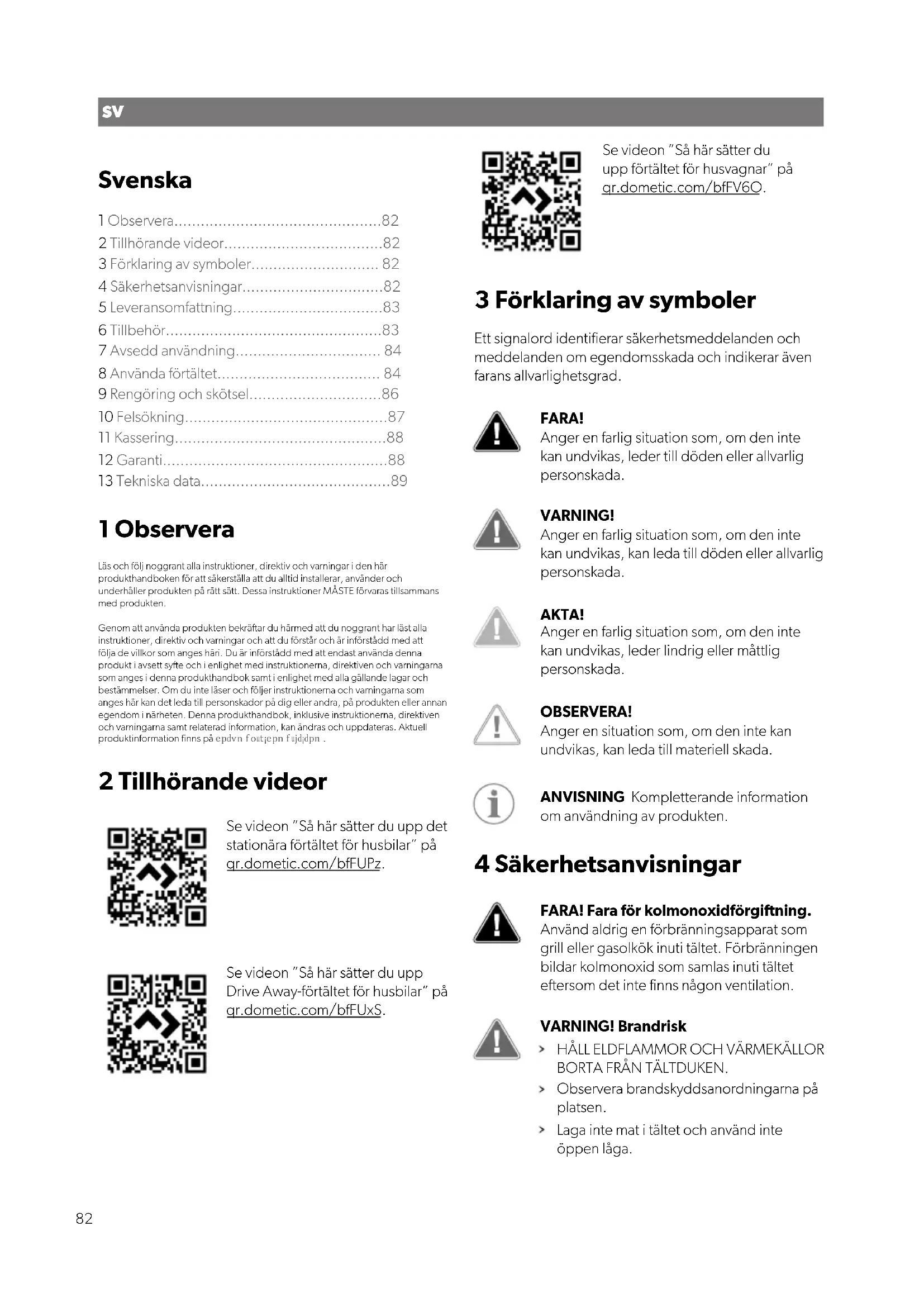 - en reklamationsgrund eller en fejlbeskrivelse. Vær opmærksom på, at egne eller uprofessionelle reparationer kan få sikkerhedsmæssige konsekvenser og kan gøre garantien ugyldig. Garantien dækker produktionsfejl, materialer og dele. Garantien dækker ikke falmning af afdækningen og slitage samt UV-nedbrydning, misbrug, utilsigtet beskadigelse, stormskader, permanent eller halvpermanent brug eller brug i kommercielt øjemed. Den dækker ikke følgeskader. Kontakt din forhandler i forbindelse med krav. Dette påvirker ikke dine lovmæssige krav. 80DA 13 Tekniske data Bredde (mm) Dybde (mm) Vægt (kg) Min. vægt (kg) Grande AIR Tour 390 S 390 300 24.5 /7.24 18.1 Grande AIR Tour 390 M 390 300 25.1 / 7.2 18.6 Rally AIR Tour 200 S 200 250 19 10.3 Rally AIR Tour 260 S 260 250 24.2 13.1 Rally AIR Tour 260 M 260 250 24.7 13.7 Rally AIR Tour 330 S 330 250 26 14.1 Rally AIR Tour 330 M 330 250 26.5 14.7 Rally AIR Tour 390 S 390 250 27.6 15.2 Rally AIR Tour 390 M 390 250 28.1 15.2 Rally AIR Tour 260 DA 260 250 25.1 / 7.2 15 Rally AIR Tour 330 DA 330 250 26.5 / 8.2 20.7 Rally AIR Tour 390 DA 390 250 27.1 / 9.1 24 Leggera AIR 220 S 220 240 8.7 7.4 Leggera AIR 260 S 260 240 12.2 8.4 Leggera AIR 260 M 260 240 12.6 9 81SV Svenska 1 Observera...............................................82 2 Tillhörande videor....................................82 3 Förklaring av symboler............................. 82 4 Säkerhetsanvisningar................................82 5 Leveransomfattning..................................83 6 Tillbehör.................................................83 7 Avsedd användning................................. 84 8 Använda förtältet..................................... 84 9 Rengöring och skötsel..............................86 10 Felsökning..............................................87 11 Kassering................................................88 12 Garanti...................................................88 13 Tekniska data...........................................89 1 Observera Läs och följ noggrant alla instruktioner, direktiv och varningar i den här produkthandboken för att säkerställa att du alltid installerar, använder och underhåller produkten på rätt sätt. Dessa instruktioner MÅSTE förvaras tillsammans med produkten. Genom att använda produkten bekräar du härmed att du noggrant har läst alla instruktioner, direktiv och varningar och att du förstår och är införstådd med att följa de villkor som anges häri. Du är införstådd med att endast använda denna produkt i avsett sye och i enlighet med instruktionerna, direktiven och varningarna som anges i denna produkthandbok samt i enlighet med alla gällande lagar och bestämmelser. Om du inte läser och följer instruktionerna och varningarna som anges här kan det leda till personskador på dig eller andra, på produkten eller annan egendom i närheten. Denna produkthandbok, inklusive instruktionerna, direktiven och varningarna samt relaterad information, kan ändras och uppdateras. Aktuell produktinformation finns på documents.dometic.com. 2 Tillhörande videor Se videon ”Så här sätter du upp det stationära förtältet för husbilar” på qr.dometic.com/bfFUPz. Se videon ”Så här sätter du upp Drive Away-förtältet för husbilar” på qr.dometic.com/bfFUxS. Se videon ”Så här sätter du upp förtältet för husvagnar” på qr.dometic.com/bfFV6O. 3 Förklaring av symboler Ett signalord identifierar säkerhetsmeddelanden och meddelanden om egendomsskada och indikerar även farans allvarlighetsgrad. FARA! Anger en farlig situation som, om den inte kan undvikas, leder till döden eller allvarlig personskada. VARNING! Anger en farlig situation som, om den inte kan undvikas, kan leda till döden eller allvarlig personskada. AKTA! Anger en farlig situation som, om den inte kan undvikas, leder lindrig eller måttlig personskada. OBSERVERA! Anger en situation som, om den inte kan undvikas, kan leda till materiell skada. ANVISNING Kompletterande information om användning av produkten. 4 Säkerhetsanvisningar FARA! Fara för kolmonoxidförgiftning. Använd aldrig en förbränningsapparat som grill eller gasolkök inuti tältet. Förbränningen bildar kolmonoxid som samlas inuti tältet eersom det inte finns någon ventilation. VARNING! Brandrisk HÅLL ELDFLAMMOR OCH VÄRMEKÄLLOR BORTA FRÅN TÄLTDUKEN. Observera brandskyddsanordningarna på platsen. Laga inte mat i tältet och använd inte öppen låga. 82SV VARNING! Kvävningsrisk Kontrollera att ventilationsöppningarna alltid är öppna för att undvika kvävningsrisk. AKTA! Risk för personskada. Denna apparat får inte användas av personer (inklusive barn) med nedsatt fysisk, sensorisk eller mental förmåga, eller som inte har erfarenhet eller tillräckliga kunskaper, såvida inte apparaten används under uppsikt eller med tillräcklig vägledning av en person som ansvarar för säkerheten. Låt inte barn leka i närheten och se till att de använder lämpliga skyddande skor. Staglinor innebär snubblingsrisk och pinnarna kan vara vassa. Utan uppsikt får barn inte utföra rengörings- eller underhållsarbeten. Håll fritt på gångvägarna. 5 Leveransomfattning Grande AIR Tour, Rally AIR Tour Komponent Mängd Förtält 1 Pinnsats 1 Sidopanel 2 Frontpanel 2 Gardinsats 1 Vagnskappa (Förutom storlek M) 1 Handpump 1 Transportväska 1 Monterings- och bruksanvisning 1 Leggera AIR Tour Komponent Mängd Förtält 1 Pinnsats 1 Vagnskappa (Förutom storlek M) 1 Handpump 1 Transportväska 1 Monterings- och bruksanvisning 1 Rally AIR Tour DA Komponent Mängd Förtält 1 Pinnsats 1 6 m anslutningsrem 3 Gardinsats 1 Sidopanel 2 Frontpanel 2 Dörrpanel till anslutningstunneln 2 Monsoon-stolpe till anslutningstunneln 1 Handpump 1 Transportväska 2 Monterings- och bruksanvisning 1 6 Tillbehör Följande tillbehör finns tillgängliga (ingår inte i leveransen): Komponent Art.nr Leggera AIR 220-baldakin 9120000289 Leggera AIR 260-bal