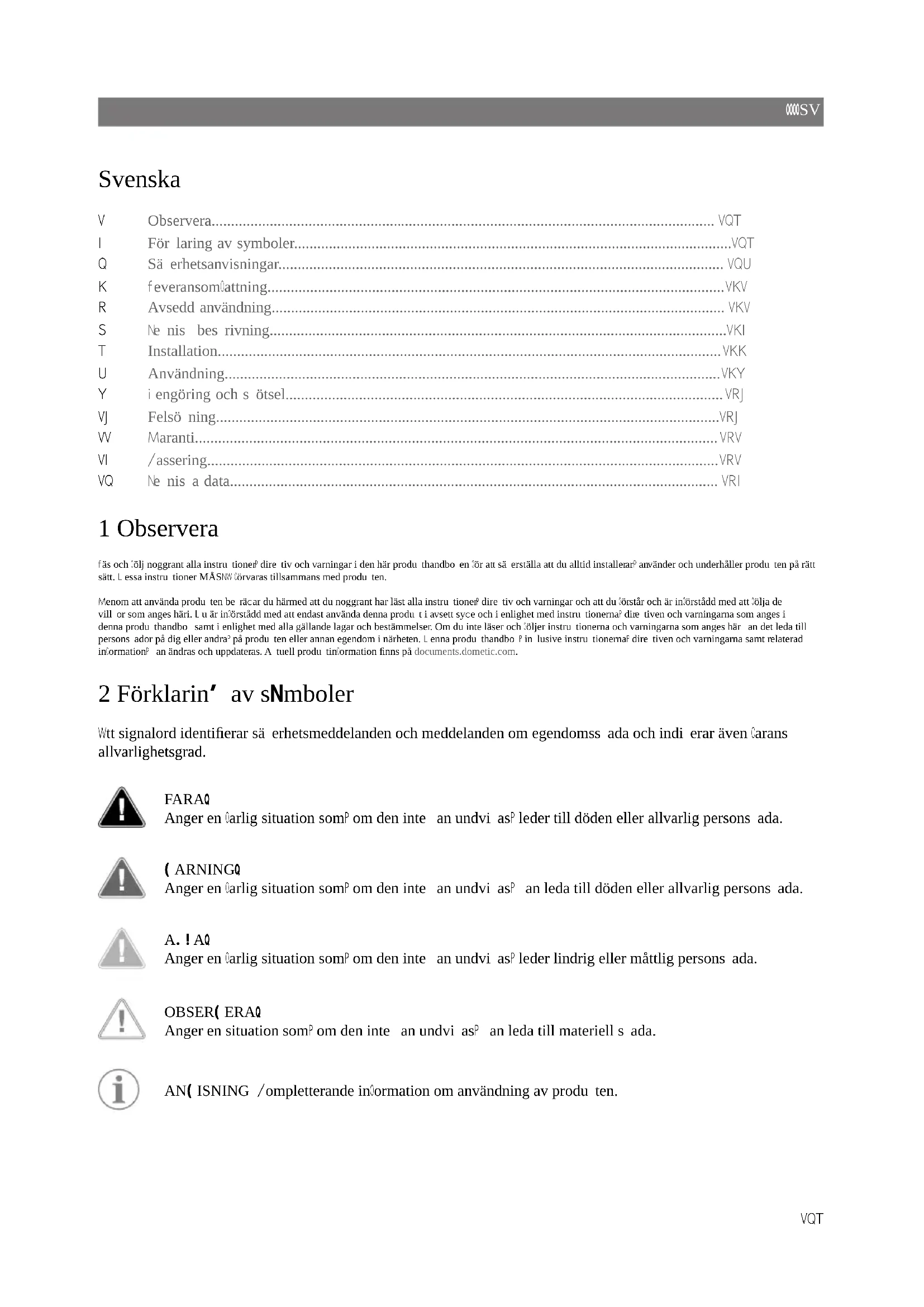 - 13 Tekniska data 1 Observera Läs och följ noggrant alla instruktioner, direktiv och varningar i den här produkthandboken för att säkerställa att du alltid installerar, använder och underhåller produkten på rätt sätt. Dessa instruktioner MÅSTE förvaras tillsammans med produkten. Genom att använda produkten bekräar du härmed att du noggrant har läst alla instruktioner, direktiv och varningar och att du förstår och är införstådd med att följa de villkor som anges häri. Du är införstådd med att endast använda denna produkt i avsett sye och i enlighet med instruktionerna, direktiven och varningarna som anges i denna produkthandbok samt i enlighet med alla gällande lagar och bestämmelser. Om du inte läser och följer instruktionerna och varningarna som anges här kan det leda till personskador på dig eller andra, på produkten eller annan egendom i närheten. Denna produkthandbok, inklusive instruktionerna, direktiven och varningarna samt relaterad information, kan ändras och uppdateras. Aktuell produktinformation finns på documents.dometic.com. 2 Förklaring av symboler Ett signalord identifierar säkerhetsmeddelanden och meddelanden om egendomsskada och indikerar även farans allvarlighetsgrad. FARA! Anger en farlig situation som, om den inte kan undvikas, leder till döden eller allvarlig personskada. VARNING! Anger en farlig situation som, om den inte kan undvikas, kan leda till döden eller allvarlig personskada. AKTA! Anger en farlig situation som, om den inte kan undvikas, leder lindrig eller måttlig personskada. OBSERVERA! Anger en situation som, om den inte kan undvikas, kan leda till materiell skada. ANVISNING Kompletterande information om användning av produkten. 137SV 3 Säkerhetsanvisningar Beakta även säkerhetsanvisningarna och riktlinjerna från fordonstillverkaren och auktoriserade verkstäder. p. 152