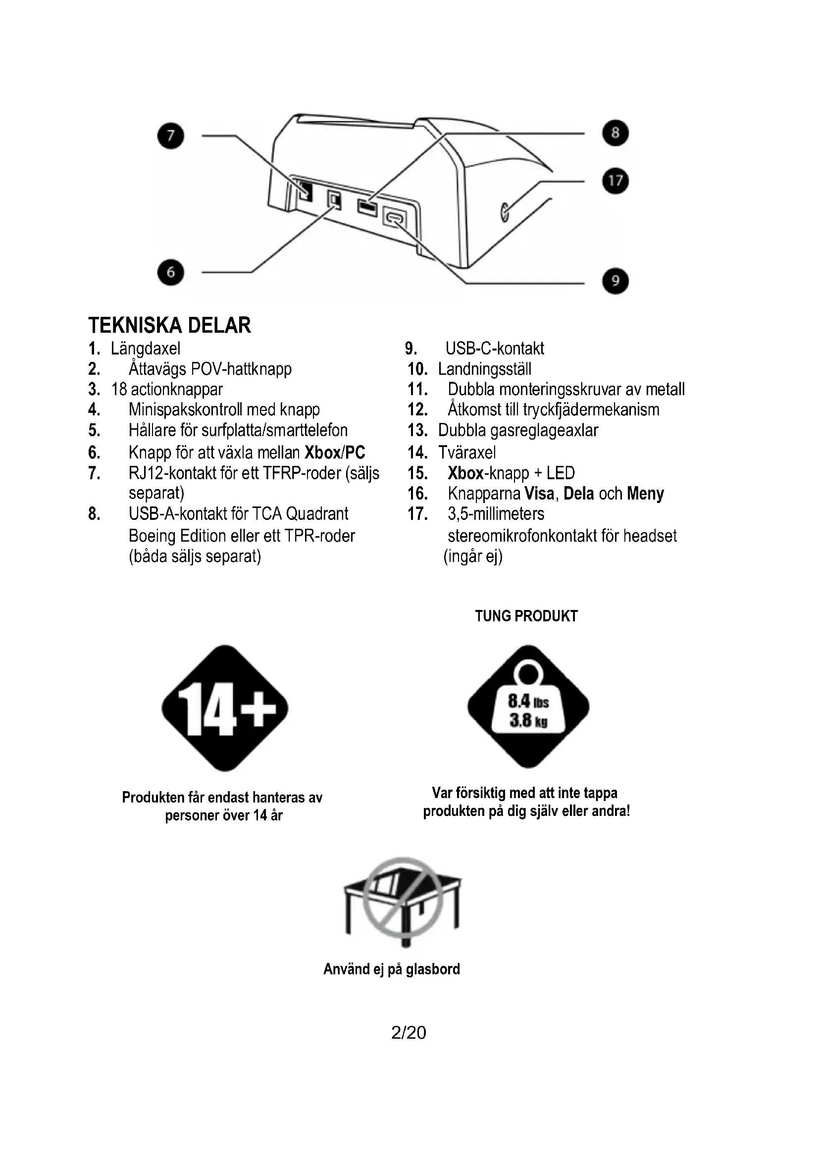 TEKNISK SUPPORT https://support.thrustmaster.com20/20 UPPHOVSRÄTTSSKYDD © 2021 Guillemot Corporation S.A. Med ensamrätt. Thrustmaster® är ett registrerat varumärke som tillhör Guillemot Corporation S.A. Tillverkad under licens från Boeing. Boeing, 787, Dreamliner, Dreamliner med en halvmåne och tillhörande utmärkande Boeing-logotyper, produktmärken och trade dress är varumärken som tillhör The Boeing Company. Windows® är ett registrerat varumärke som tillhör Microsoft Corporation i USA och/eller i andra länder. Alla andra varumärken och märkesnamn erkänns härmed och tillhör sina respektive ägare. Illustrationer är inte bindande. Innehåll, konstruktion och specifikationer kan ändras utan föregående meddelande och kan variera från land till land. Tillverkad i Kina. MILJÖSKYDD I Europeiska unionen: När produkten har slutat fungera ska den inte slängas i vanligt hushållsavfall, utan kasseras vid en uppsamlingsplats för bortskaffandet av elektriskt och elektroniskt avfall (WEEE) för återvinning. Detta bekräftas av symbolen på produkten, bruksanvisningen eller förpackningen. Beroende på dess egenskaper kan materialet kanske återvinnas. Genom återvinning och andra sätt att hantera elektriskt och elektroniskt avfall kan du göra ett viktigt bidrag till att hjälpa till att skydda miljön. Kontakta dina lokala myndigheter för information om uppsamlingsplatsen som är närmast dig. För alla andra länder: Följ lokala återvinningslagar för elektriskt och elektroniskt avfall. Behåll denna information. Färger och dekorationer kan variera. Plastfästen och lim/klister/tejp bör avlägsnas från produkten innan den används. Denna produkt överensstämmer med alla normer gällande barn som är 14 år och äldre. Denna produkt är inte lämplig att användas av barn under 14 år. www.thrustmaster.com *Gäller endast EU, Storbritannien och Turkiet