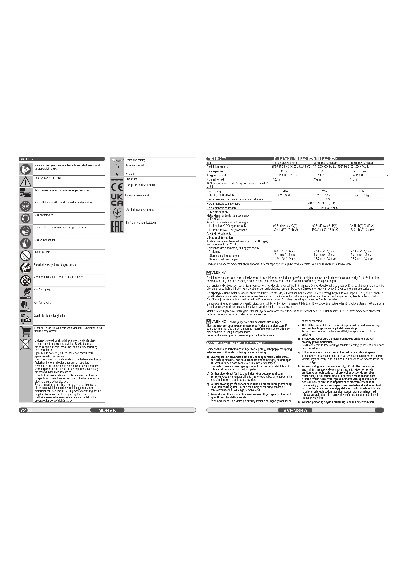 Om man använder verktyget för andra ändamål, t ex för kapning eller slipning med stålborste, kan man få andra vibrationsvärden! VARNING! De deklarerade vibrations- och bullernivåerna på detta informationsblad har uppmätts i enlighet med en standardiserad testmetod enligt EN 62841 och kan användas för att jämföra ett verktyg med ett annat. Det kan användas för en preliminär bedömning av exponeringen. Den angivna vibrations- och bullernivån representerar verktygets huvudsakliga tillämpningar. Om verktyget emellertid används för olika tillämpningar, med olika eller dåligt underhållna tillbehör, kan vibrations- och bullerutsläppet variera. Detta kan öka exponeringsnivån avsevärt över den totala arbetsperioden. Vid slipning av tunna metallplåtar eller andra strukturer med stor yta, vilka lätt kan börja vibrera, kan en betydligt högre ljudnivå (upp till 15 dB) än den angivna uppstå. Med sådana arbetsstycken rekommenderas att lämpliga åtgärder för ljuddämpning vidtas, som t.ex. användning av tunga, fl exibla isoleringsmattor. Den ökade ljudnivån ska även beaktas vid bedömningen av risken för bullerexponering och valet av lämpligt hörselskydd. En uppskattning av exponeringsnivån för vibrationer och buller bör även ta hänsyn till de tider då verktyget är avstängt eller när det körs utan att faktiskt arbeta. Detta kan avsevärt minska exponeringsnivån över den totala arbetsperioden. Identifi era ytterligare säkerhetsåtgärder för att skydda operatören mot eff ekterna av vibrationer och/eller buller såsom: underhåll av verktyget och tillbehören, hålla händerna varma, organisation av arbetsmönster. Batteridreve vinkelslip Batteridreve vinkelslip Batteridreve vinkelslip SVENSKA SYMBOLER Vennligst les nøye gjennom denne brukerhåndboken før du tar apparatet i bruk. OBS! ADVARSEL FARE! Ta ut vekselbatteriet før du arbeider på maskinen Bruk alltid vernebrille når du arbeider med maskinen. Bruk hørselsvern! Bruk derfor vernemaske som er egnet for støv. Bruk vernehansker ! Ikke bruk kraft. Før alltid verktøyet med begge hender. Vernehetten skal ikke brukes til kuttearbeider. Kun for sliping. Kun for kapping. Overhold tillatt skivetykkelse. Tilbehør - inngår ikke i leveransen, anbefalt komplettering fra tilbehørsprogrammet. Elektrisk og elektronisk avfall skal ikke avfallshåndteres sammen med husholdningsavfallet. Brukte batterier. elektrisk og elektronisk avfall skal samles kildesortert og avfallshåndteres. Fjern brukte batterier, akkumulatorer og lysmidler fra apparatene før de kasseres. Be om informasjon hos de lokale myndighetene eller hos din fagforhandler om miljøstasjoner og samlesteder. Avhengig av de lokale bestemmelsene kan detaljhandlere være forpliktet til å ta tilbake brukte batterier, elektrisk og elektronisk avfall uten kostnader. Bidra til å redusere behovet for råmaterialer ved å sørge for gjenbruk og resirkulering av dine brukte batterier og ditt elektriske og elektroniske avfall. Brukte batterier (særlig litium-ion-batterier), elektrisk og elektronisk avfall inneholder verdifulle, gjenbrukbare materialer som ved ikke-miljøriktig avfallshåndtering kan ha negative konsekvenser for miljøet og din helse. Slett først eventuelle personrelaterte data fra det brukte apparatet før det avfallshåndteres. Rotasjons retning