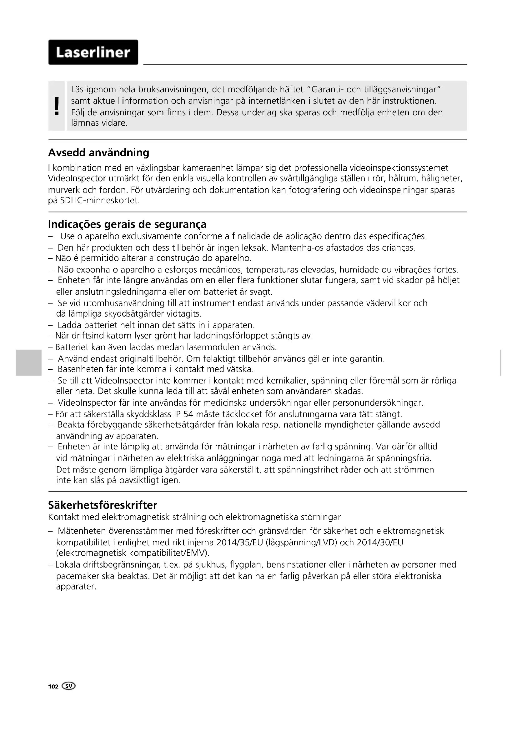 Säkerhetsföreskrifter Kontakt med elektromagnetisk strålning och elektromagnetiska störningar – Mätenheten överensstämmer med föreskrifter och gränsvärden för säkerhet och elektromagnetisk kompatibilitet i enlighet med riktlinjerna 2014/35/EU (lågspänning/LVD) och 2014/30/EU (elektromagnetisk kompatibilitet/EMV). – Lokala driftsbegränsningar, t.ex. på sjukhus, ygplan, bensinstationer eller i närheten av personer med pacemaker ska beaktas. Det är möjligt att det kan ha en farlig påverkan på eller störa elektroniska apparater. Indicações gerais de segurança – Use o aparelho exclusivamente conforme a nalidade de aplicação dentro das especicações. – Den här produkten och dess tillbehör är ingen leksak. Mantenha-os afastados das crianças. – Não é permitido alterar a construção do aparelho. – Não exponha o aparelho a esforços mecânicos, temperaturas elevadas, humidade ou vibrações fortes. – Enheten får inte längre användas om en eller era funktioner slutar fungera, samt vid skador på höljet eller anslutningsledningarna eller om batteriet är svagt. – Se vid utomhusanvändning till att instrument endast används under passande vädervillkor och då lämpliga skyddsåtgärder vidtagits. – Ladda batteriet helt innan det sätts in i apparaten. – När driftsindikatorn lyser grönt har laddningsförloppet stängts av. – Batteriet kan även laddas medan lasermodulen används. – Använd endast originaltillbehör. Om felaktigt tillbehör används gäller inte garantin. – Basenheten får inte komma i kontakt med vätska. – Se till att VideoInspector inte kommer i kontakt med kemikalier, spänning eller föremål som är rörliga eller heta. Det skulle kunna leda till att såväl enheten som användaren skadas. – VideoInspector får inte användas för medicinska undersökningar eller personundersökningar. – För att säkerställa skyddsklass IP 54 måste täcklocket för anslutningarna vara tätt stängt. – Beakta förebyggande säkerhetsåtgärder från lokala resp. nationella myndigheter gällande avsedd användning av apparaten. – Enheten är inte lämplig att använda för mätningar i närheten av farlig spänning. Var därför alltid vid mätningar i närheten av elektriska anläggningar noga med att ledningarna är spänningsfria. Det måste genom lämpliga åtgärder vara säkerställt, att spänningsfrihet råder och att strömmen inte kan slås på oavsiktligt igen.SV VideoInspector