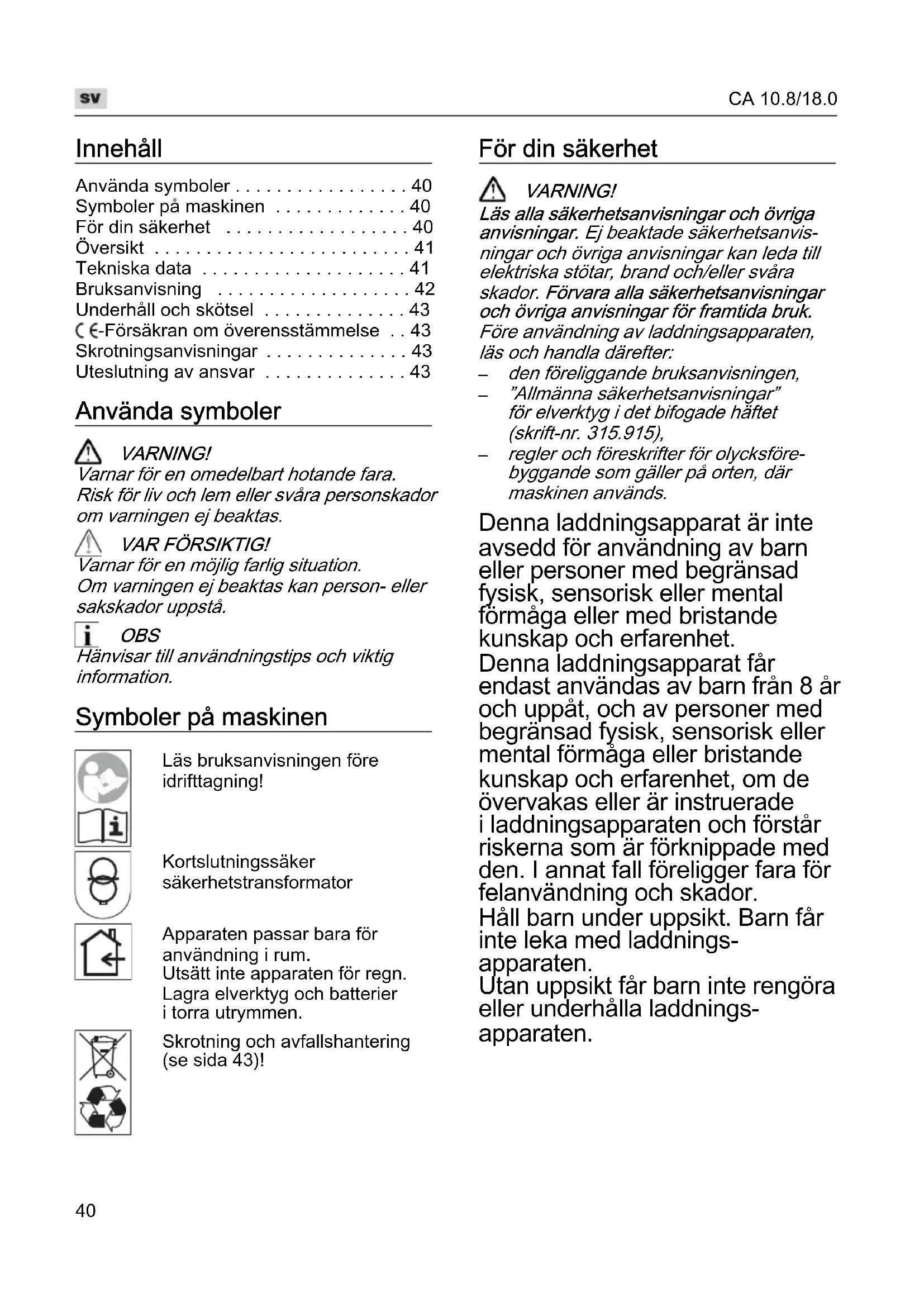 regler och föreskrifter för olycksföre- byggande som gäller på orten, där maskinen används. Denna laddningsapparat är inte avsedd för användning av barn eller personer med begränsad fysisk, sensorisk eller mental förmåga eller med bristande kunskap och erfarenhet. Denna laddningsapparat får endast användas av barn från 8 år och uppåt, och av personer med begränsad fysisk, sensorisk eller mental förmåga eller bristande kunskap och erfarenhet, om de övervakas eller är instruerade i laddningsapparaten och förstår riskerna som är förknippade med den. I annat fall föreligger fara för felanvändning och skador. Håll barn under uppsikt. Barn får inte leka med laddnings- apparaten. Utan uppsikt får barn inte rengöra eller underhålla laddnings- apparaten.CA 10.8/18.0