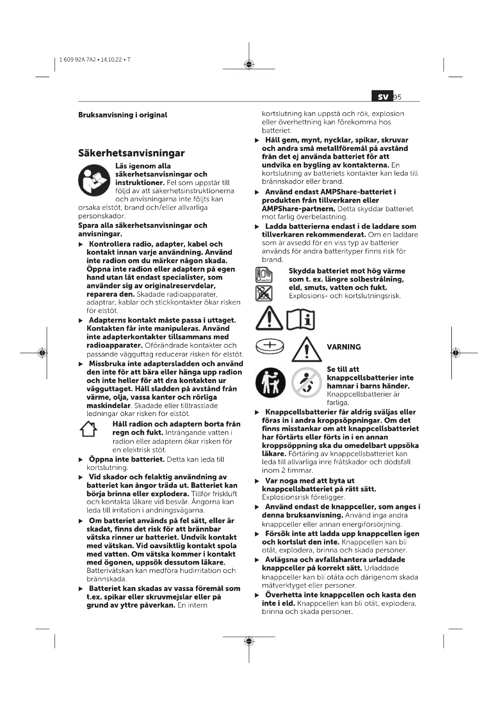 Aktuell ljudkälla visas i indikeringen Ljudkälla(b) resp. Bluetooth ®(a). Ljudkällorna DAB och DAB2 samt FM och FM2 skiljer sig inte i funktion, utan utgör bara extra kanalplatser. Ställa in/spara DAB+-kanalSvensk För val av ljudkällan DAB+-kanal trycker du på knappen Source(7) tills indikeringen Ljudkälla(b) visar DAB eller DAB2. 98 sv 1 609 92A 7AJ • 14.10.22 • TEfter en kort startprocedur spelas senast inställda radiokanal upp. Kanalens namn visas i den översta raden i multifunktionsindikeringen(j). I menyn kan du ställa in vilken ytterligare information som ska visas i den undre raden på multifunktionsindikeringen. – För att byta kanal vrider du knappen Source(7) tills önskad kanal visas i displayen. Tryck på knappen Source(7) för att bekräfta valet. Radion växlar till vald kanal. Som alternativ kan du trycka på knappen Nedåtsök(10) eller knappen Uppåtsök(9). Radion växlar till nästa tillgängliga kanal (i alfabetisk ordning stigande eller fallande). – För att spara en inställd kanal trycker du på kanalknappen(5) för önskad plats tills numret för önskad plats visas i indikeringen Minnesplats(c). Om de fyra minnesplatserna för ljudkällaDAB är upptagna, tryck på knappen Source(7) för att växla till ljudkällan DAB2, där ytterligare fyra minnesplatser finns tillgängliga. Observera att du måste ställa in önskad kanal på nytt efter ett byte för att kunna spara den. – För att spela upp en sparad kanal trycker du kort på en av kanalknapparna(5). Minnesplatsens nummer visas i indikeringen Minnesplats(c). Tryck eventuellt på knappen Source(7) för att växla mellan ljudkällorna DAB och DAB2 för att få tillgång till alla sparade kanaler. Observera: vid svag radiosignal visas<Weak Signal> i multifunktionsindikeringen(j). I detta fall kan du starta DAB+-kanalsöket manuellt. Antingen väljer du<Auto Scan> i menyn, eller så trycker du på knappen Nedåtsök(10) och knappen Uppåtsök(9) samtidigt. När sökningen har avslutats sparas fyra kanaler på kanalplats 1 till 4. Kanaler som redan sparats skrivs över. Om ingen DAB+-kanal kan hittas visas <No DAB Station– Please Auto Scan> i multifunktionsindikeringen(j). Ställa in/spara UKV-radiokanalSvensk För att välja ljudkällan UKV-kanal trycker du på knappen Source(7) tills indikeringen Ljudkälla(b) visar FM eller FM2. Frekvensen för radiokanalen som spelas upp visas i den översta raden i multifunktionsindikeringen(j). I menyn kan du ställa in vilken ytterligare information som ska visas i den undre raden på multifunktionsindikeringen. Vid tillräckligt bra signal växlar radion automatiskt till stereomottagning, och på displayen visas indikeringen Stereomottagning(h). I menyfunktionen kan man växla till monomottagning. – För att ställa in en viss kanal vrider du på knappen Source(7) (TUNE) tills önskad frekvens resp. önskad kanal visas på displayen. – För att söka efter nästa kanal med hög signalstyrka trycker du kort på knappen Nedåtsök(10) eller knappen Uppåtsök(9). Nästa kanal som hittas visas på displayen och spelas upp. – För att söka efter alla kanaler med hög signalstyrka trycker du på knappen Nedåtsök(10) eller knappen Uppåtsök(9) i mer än en halv sekund. Varje kanal som hittas spelas upp i 5sekunder, därefter fortsätter sökningen till slutet av frekvensbandet. För att avbryta kanalsökningen, tryck kort på knappen Nedåtsök(10) eller knappen Uppåtsök(9). – För att spara en inställd kanal trycker du på kanalknappen(5) för önskad plats tills numret för önskad plats visas i indikeringen Minnesplats(c). Om de fyra minnesplatserna för ljudkällaFM är upptagna, tryck på knappen Source(7) för att växla till ljudkällanFM2, där ytterligare fyra minnesplatser finns tillgängliga. Observera att du måste ställa in önskad kanal på nytt efter ett byte för att kunna spara den. – För att automatiskt söka och spara kanalen med högst signalstyrka (AUTOSTORE) trycker du på knappen Nedåtsök(10) och knappen Uppåtsök(9) samtidigt. Radion kontrollerar alla mottagningsbara kanaler och sparar de fyra kanaler som har bäst signalstyrka på programplatserna 1 till 4. Observera att eventuella tidigare kanaler skrivs över. När sökningen har avslutats spelas den kanal upp som är sparad på kanalplats 1. – För att spela upp en sparad kanal trycker du kort på en av kanalknapparna(5). Minnesplatsens nummer visas i indikeringen Minnesplats(c). Tryck eventuellt på knappen Source(7) för att växla mellan ljudkällorna FM och FM2 för att få tillgång till alla sparade kanaler. Rikta upp stavantennenSvensk Radion levereras med monterad stavantenn(6). Vid användning i UKV-läge, vrid antennen i den riktning som ger bäst mottagning. Om det inte finns tillräcklig mottagning, ställ radion på en annan plats. Observera: om radion används i närheten av trådlösa system eller andra elektroniska apparater kan radiomottagningen påverkas. Ansluta externa ljudkällor via AUXSvensk Öppna skyddskåpan på anslutningsfacket(15) och sätt in 3,5‑mm-kontakten på AUX- kabeln(25) i AUXIN-uttaget(24). Anslut AUX- kabeln till lämplig ljudkälla. sv 99 1 609 92A 7AJ • 14.10.22 • TFör att spela upp AUX-ljudkällan trycker du på knappen Source(7) tills indikeringen Ljudkälla(b) visar AUX. Stäng till sist skyddskåpan på anslutningsfacket(15) igen när du tar ut AUX- kabelns kontakt. Om du trycker på en av kanalknapparna(5) i AUX-läge växlar radion till den kanal som senast sparats i samma läge. Spela upp/styra externa ljudkällor via Bluetooth®Svensk För att spela upp en ljudkälla (t.ex. smarttelefon) via Bluetooth ® trycker du antingen på knappen Source(7) tills indikeringen Bluetooth ®(a) visas på displayen eller kort på knappen Bluetooth